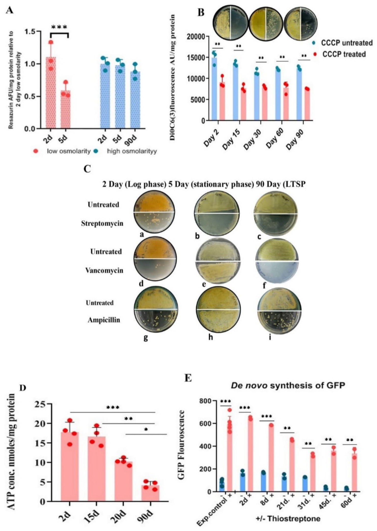 Metabolic status of LTSP cells. (A) Metabolic activity measured by reduction of resazurin: Similar to exponentially growing cells, LTSP cells can efficiently reduce blue non-fluorescent dye resazurin to fluorescent resorufin, a measure of the metabolically active status of the cells. Representative data from three independent experiments are shown. (B) LTSP cells actively maintain membrane potential: The membrane potential of cells, 2 days through 90 days, can be dissipated by the ionophore CCCP that results in the decrease in the accumulation of membrane potential-sensitive dye DiOC6(3). The effect of treatment on reduction in CFU is evident in plating 50 μL of cells at 100 and at 10−1 dilution on the left-and right half of the agar plate, respectively. Representative data from three independent experiments are shown. (C) Antibiotic sensitivity profile of LTSP cells: Representative images show that cells from all stages of growth are sensitive to streptomycin (a, b, c). Both LTSP (90 days) (f, i) and exponentially growing cells (2 days) (d, g) are killed by cell-wall synthesis inhibitors, vancomycin, and ampicillin. Stationary phase cells (5 days grown in low osmolarity TSB), on the contrary, are resistant to vancomycin and ampicillin (e, h). (D) Determination of ATP concentration in the cells cultured for different days in high osmolar medium to stationary phase: ATP concentration was determined in the cells cultivated in high osmolar medium for different days (from 2 to 90 days) using the kit from Invitrogen (A22066). Representative data from four independent experiments are shown. (E) The de novo synthesis of GFP in LTSP cells grown for different days in high osmolarity medium: de novo GFP synthesis was measured in cells grown for different days in high osmolarity broth by fluorescence spectroscopy. Induction of GFP was carried out by the addition of 50 μg/mL of thiostrepton to cells drawn on different days, measured after 48 h of treatment with the inducer and compared with untreated cells and the control (exponential cells control) cells cultured in the presence of thiostrepton for 2–3 days. Representative data from two independent experiments are shown.