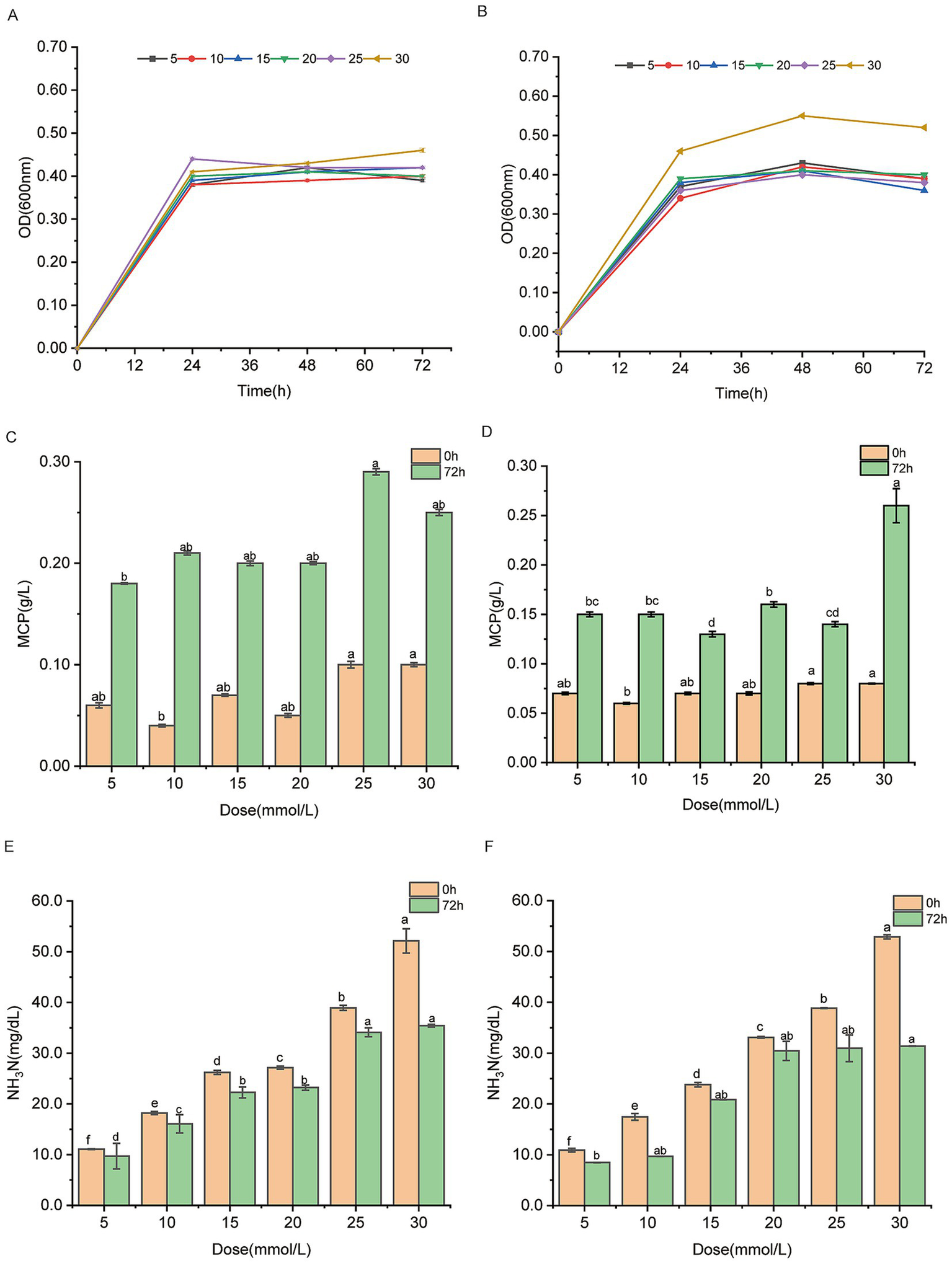 Ammonia nitrogen utilizing capacities of Lactobacillus agilis W70 and Lactobacillus fermentum M50 with 5, 10, 15, 20, 25, 30 mmol/L ammonium sulfate as the sole nitrogen source. (A,B) Growth curves over 72 h. (C,D) MCP yields at 0 and 72 h. (E,F) Ammonia nitrogen utilizing capacities at 0 and 72 h. Data are shown as mean ± standard deviation of three experiments. Different letters refer to statistically significant differences at p < 0.05.