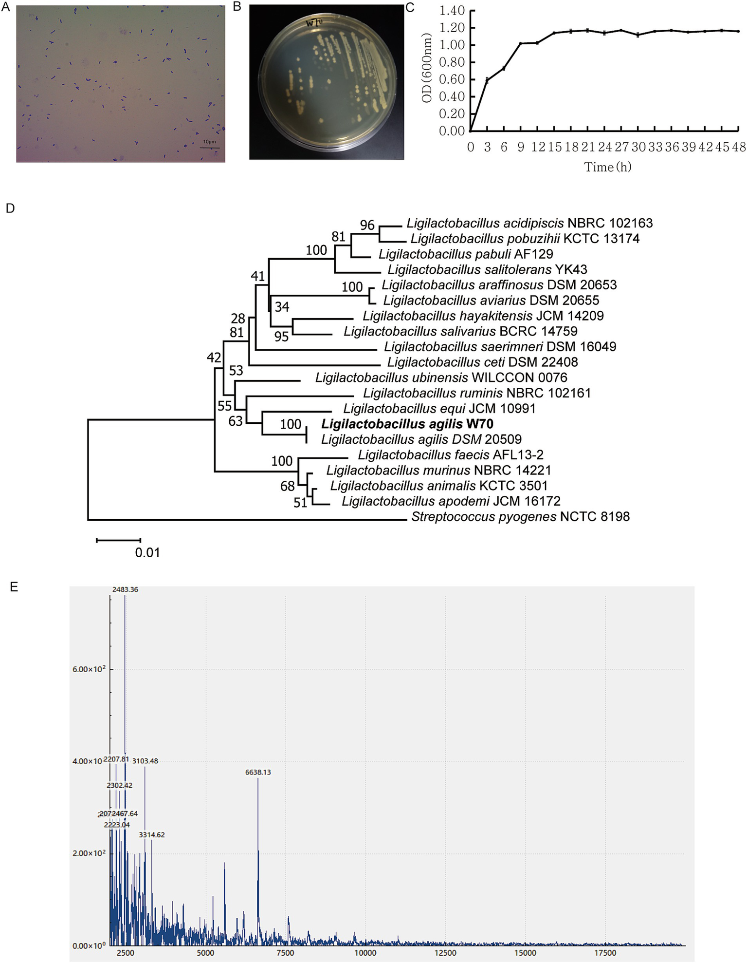 Morphological and physiochemical characters of Ligilactobacillus agilis W70. (A) Gram staining. (B) Colonies on MRS plate at 39°C. (C) Growth curve over 48 h in MRS broth at 39°C. Data are shown as mean ± standard deviation of triplicate. (D) Phylogenetic tree of the genus Ligilactobacillus constructed using the neighbor joining method based on the partial sequence of 16S rRNA gene. (E) MALDI-TOF MS profile of the ribosomal protein.