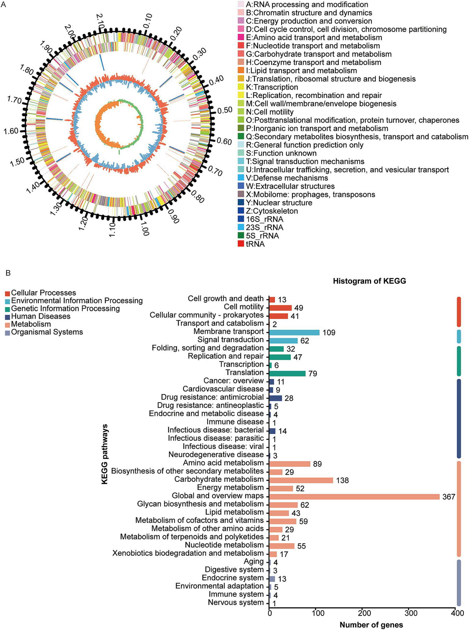 The genome of the W70 strain is 2.17 Mb in size, with a G + C content of 41.7% (Figure 4A), and contains 2037 coding sequences, 90 tRNAs, 24 rRNA genes (8 copies of each 5S rRNA, 16S rRNA, and 23S rRNA), 32 sRNAs, 31 tandem repeats, 11 interspersed repeats, 11 gene islands, 1 prophage, 8 CRISPR repeats, 3 insertion sequences, and 12 transposons (Table 3). KEGG analysis indicated that most of the annotated genes are involved in carbohydrate metabolism (138 genes), membrane transport (109 genes), amino acid metabolism (89 genes), and metabolism of other amino acids (29 genes) (Figure 4B). GO analysis identified 834 genes related to molecular function (MF), 616 genes related to biological processes (BP), and 557 genes related to cellular components (CC) (Supplementary Figure S3A). COG analysis classified the putative proteins in three main groups, translation, ribosomal structure and biogenesis (193), carbohydrate transport and metabolism (172 genes), and amino acid transport and metabolism (144) (Supplementary Figure S3B).