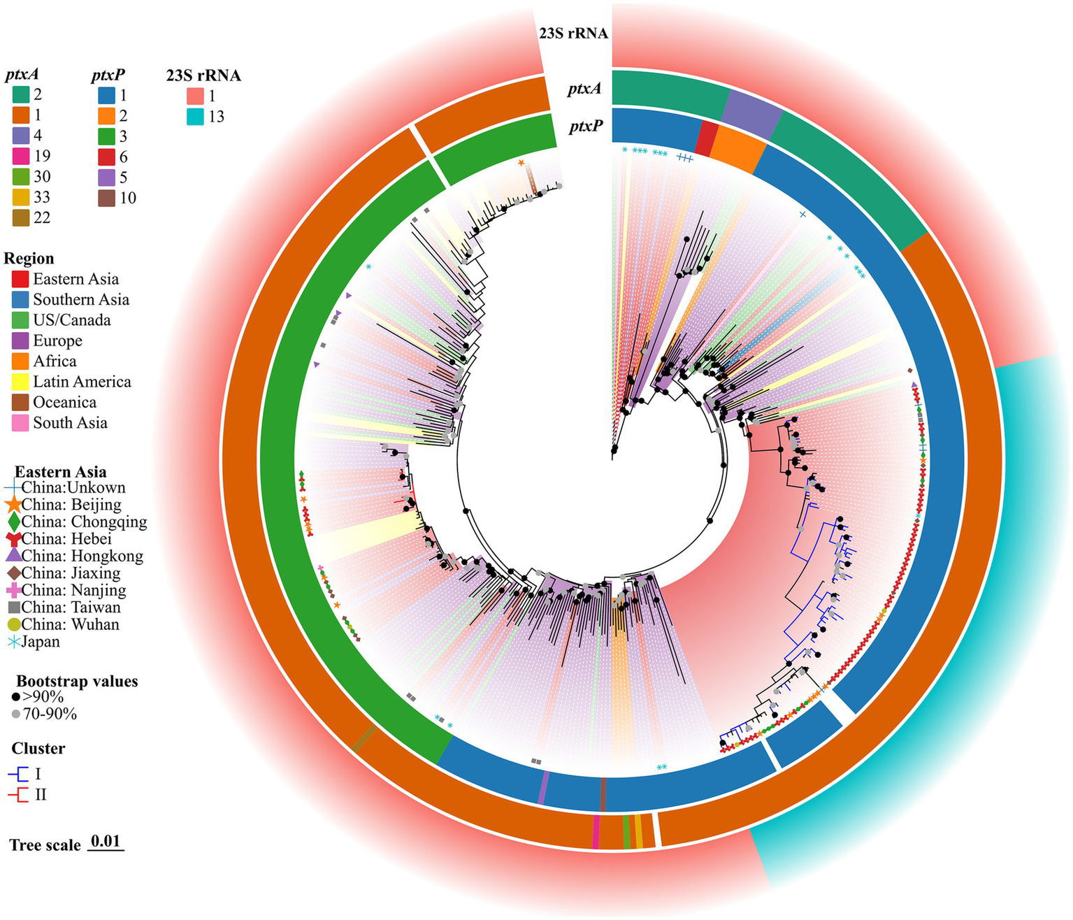 ML phylogenetic tree of 62 Hebei, China, and 313 global BP strains, 2019–2020. Tohama I was used as the outgroup. The ERY resistant lineages I and ERY sensitive lineages II in this study were marked by blue and red, respectively. The BP of eight regions were represented in different colors. Regions in Eastern Asia were represented by graphics of different shapes and colors. Isolate details (ptxA, ptxP and 23S rRNA allele type) were shown as color codes as per the legends. The blank space in the figure represents the gene deletion corresponding to the BP. Bootstrap values greater than or equal to 70 were shown in the figure as circles of two different colors, the proportion of branch length was expressed as 0.01.