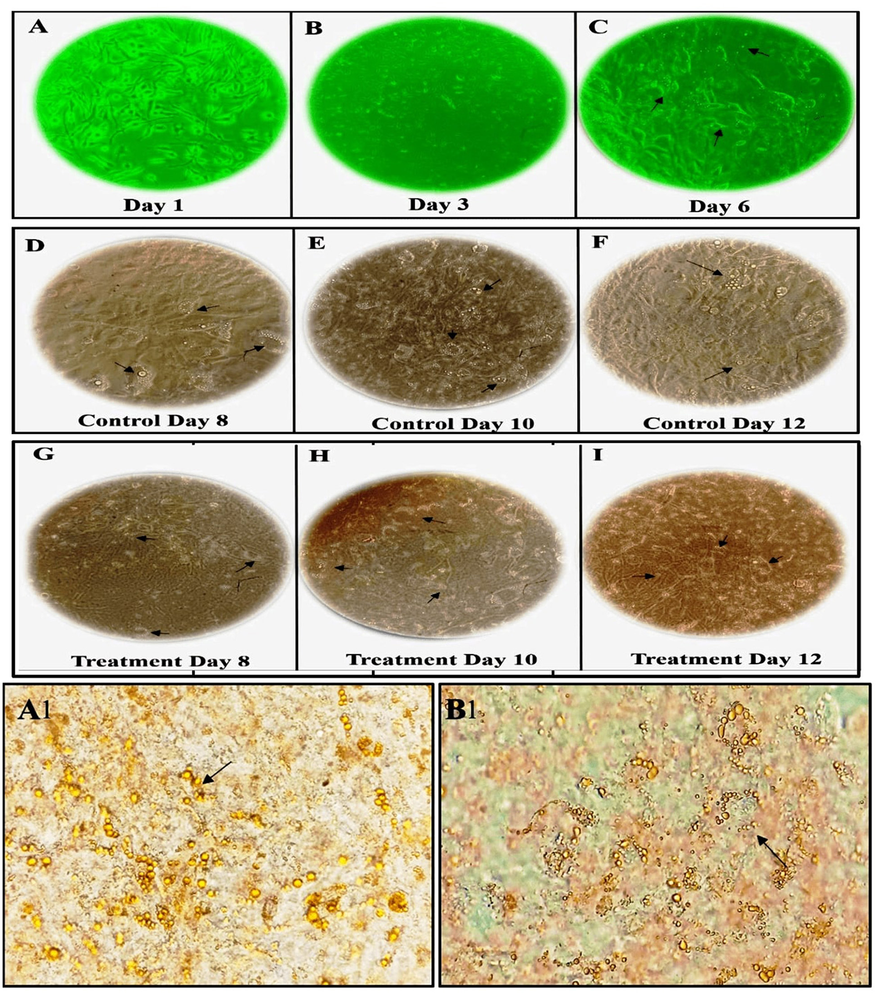 Morphological changes and Oil Red O staining of 3T3-L1 cells before and after adipogenic stimulation. (A–C) morphological features of 3T3-L1 cells from Days 1 to 6 (Pre-treatment), (D–I) morphological features of 3T3-L1 cells from Days 8 to 12 (Post-treatment), showing both control (D–F), and LBR54-treated cells (G–I). After adipogenic stimulation, lipid droplet accumulation occurred more rapidly in Control cells compared to treated 3T3-L1 cells (Black arrow). Oil Red O staining on Day 14 further illustrates the accumulation of lipid droplets (Black arrow) in (A1) control untreated cells compared to (B1) LBR54 treated 3T3-L1 cells.
