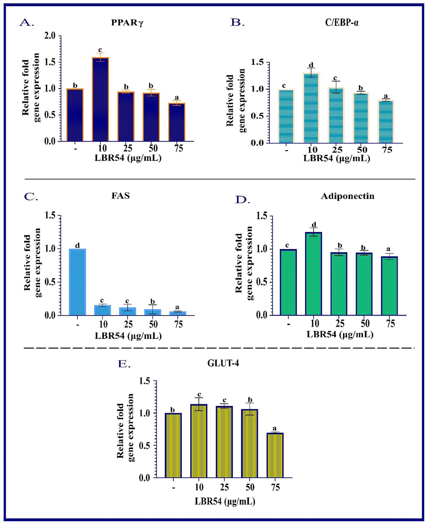 The RNA extraction and qRT-PCR analysis of 3T3-L1 cells treated with LBR54 reveal that gene expression is influenced by the concentration of LBR54, highlighting complex regulatory effects. Figure 2 illustrates the concentration-dependent responses of several key genes involved in adipogenesis. At higher LBR54 concentrations (25 μL, 50 μL, and 75 μL), PPAR-γ expression was upregulated. This suggests that LBR54 may initially stimulate PPAR-γ expression, thereby promoting adipocyte differentiation. However, the elevated PPAR-γ levels at higher concentrations could indicate either a positive feedback mechanism or a differential regulatory effect of LBR54 (Figure 2A). Similar to PPAR-γ, C/EBP-α showed increased expression at higher concentrations of LBR54 (25 μL, 50 μL, and 75 μL). This suggests that LBR54 potentially promotes early adipocyte differentiation through upregulation of C/EBP-α (Figure 2B). Our findings highlight the concentration-dependent effects of LBR54 on gene expression in 3T3-L1 cells, underscoring the complexity of its impact on adipogenesis. The initial upregulation of PPAR-γ and C/EBP-α at higher concentrations suggests that LBR54 might stimulate adipocyte differentiation, with potential positive feedback or alternative regulatory mechanisms at play at higher doses (Kim et al., 2020; Sreepathi et al., 2023; Xu et al., 2024).