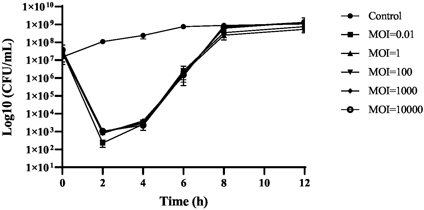 Salmonella enteritidis was cultured to OD600 of 0.5 (~108 CFU/mL) and diluted to a concentration of 107 colony-forming units (CFU)/ml. Then, the phage cocktail solution was added to the host at a multiplicity of infection (MOI) of 0.01, 1, 100, 1,000 and 10,000, and samples were incubated at 37°C with moderate shaking. Bacterial growth in the fluid culture was monitored by quantifying the bacterial titer (cell count) at different points in time, and the CFU was calculated accordingly. LB medium was used as a negative control. The experiment was performed in triplicate (Kim et al., 2020).