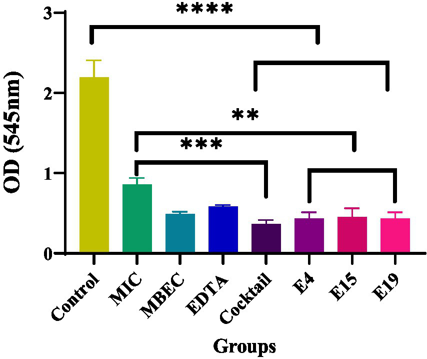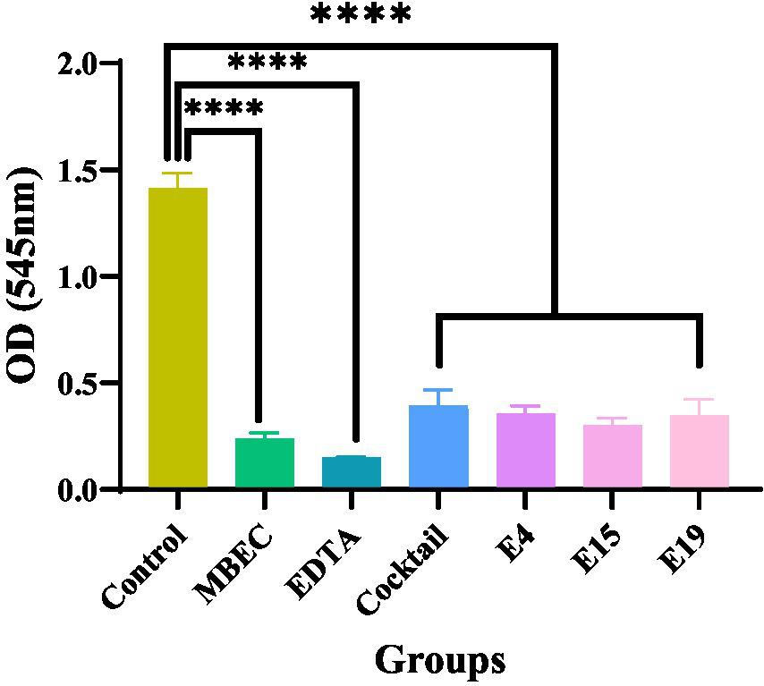 This test investigated the lytic activity of E4, E15, and E19 phages individually, as well as in a phage cocktail (pfu/ml 1010), compared to the antibiotic control with the minimum biofilm eradication concentration (MBEC) (μg/ml 1,024) in inhibiting biofilm formation within 24 h. The results showed that both the phage and phage cocktail, similar to the antibiotic control, significantly reduced biofilm formation after 24 h compared with the control (p ≤ 0.0001; Figure 3).