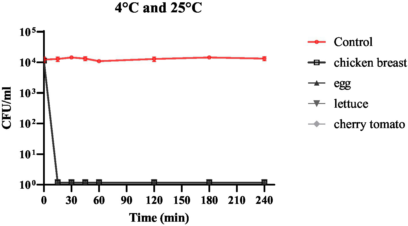 The efficacy of phage cocktail as a biocontrol agent in food has been evaluated in chicken breast, cherry tomatoes, quail eggshells, and lettuce, as these foods have been identified in multiple CDC reports as potential sources of Salmonella transmission (CDC, 2022; Whitworth, 2023; Johnston, 2023). The samples were purchased from a local supermarket then sliced aseptically in the laboratory. The samples were first checked for contamination with Salmonella spp., according to the WHO protocol (protocol number: 2010GFNLAB001). The samples were aseptically cut into 1 × 1 cm2 pieces and inoculated with S. enteritidis to a final viable count of 4 log10 CFU/cm2. After 30 min, phage cocktail was added at a final concentration of 108 PFU/ cm2, and samples were incubated at 4°C or 25°C for 15–240 min. The samples were kept under sterile conditions in the center of the plate. For the recovery of bacterial loads from food products, 1 cm2 samples were collected at intervals of 0, 15, 30, 45, 60, 120 and 240 min during incubation. Each sample was then placed in a 2 mL Eppendorf tube with 1 mL of PBS buffer added under sterile conditions. The samples were homogenized using sterile bars and vortexed. To prevent the bacteriophage from being plated, 1 mL of the homogenized sample was centrifuged at 3000× g for 10 min to precipitate the bacteria, after which the supernatant containing the phage was discarded. Changes in bacterial viability counts for both control and experimental groups were assessed by adding 1 mL of PBS, followed by vigorous vortexing, serial dilution, and plating at each time point. CFU were determined using xylose lysine deoxycholate agar (XLD agar; Shahin et al., 2021). All experiments were performed in triplicates.