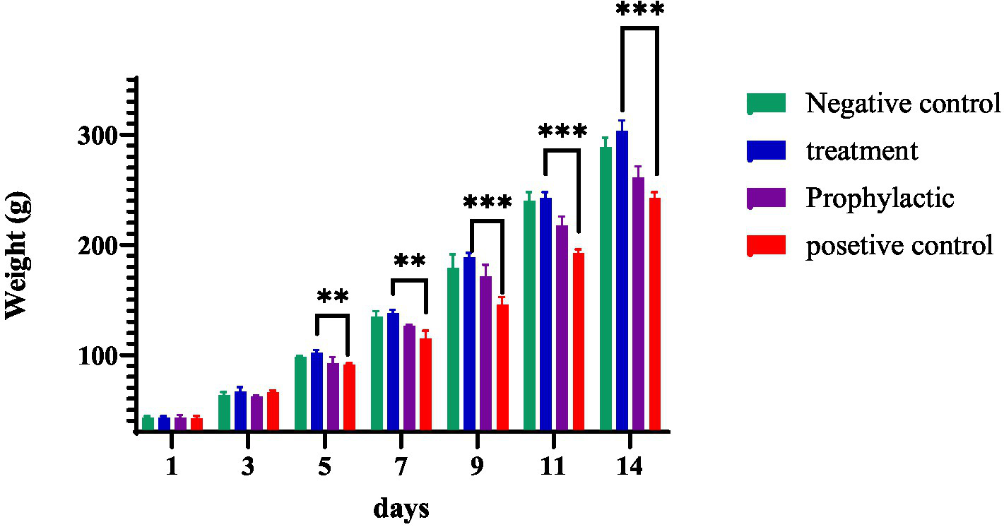 During the 14-day maintenance period, the weights of the chicks were measured every other day. There was a significant increase in weight gain in the treatment group compared to that of the untreated group (positive control), which remained significant until the end of the period (p ≤ 0.0002; Figure 6). Animals were examined daily for clinical symptoms and mortality. No casualties were recorded in the treatment group; however, in the positive control group, 10% mortality was observed.