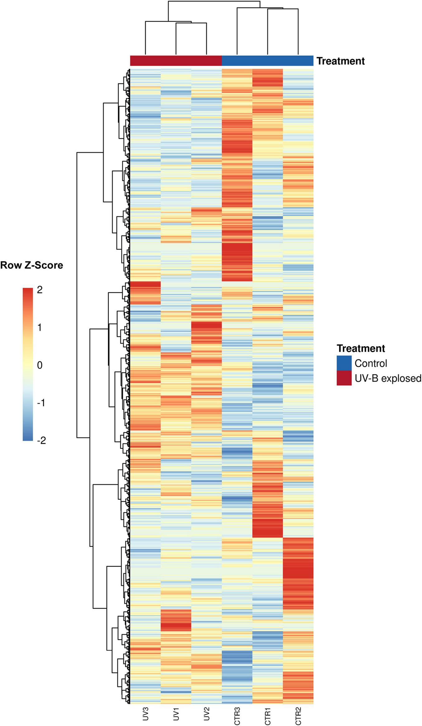 The RNA-seq quality was considered satisfactory by the FastQ quality check, and most of the sequences were between 30 and 40 on the Phred scale. On average, 12,164,853 reads were obtained per control library and 11,962,780 per UV-B exposed. After the pre-processing steps that included adapter removal and quality control, a reduction of approximately 1.38% of the original counts was observed (Supplementary Table 2).