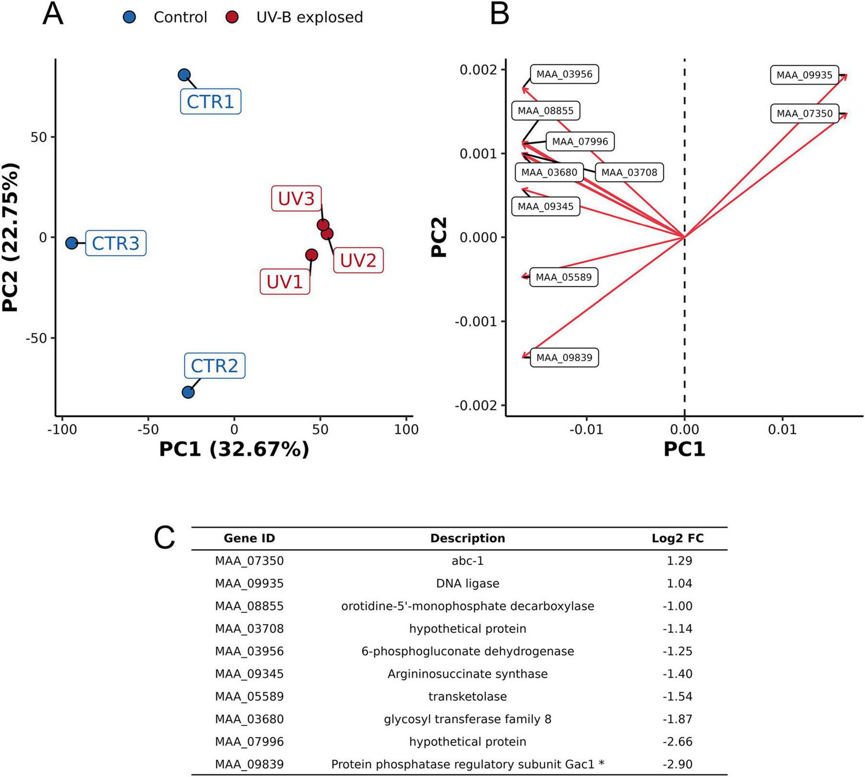 Principal component analysis of the transcriptome for comparison of Metarhizium pingshaense blastospores exposed or not to UV-B. (A) Score plot of PC1 and PC2. Control samples are black dots, and UV-B exposed samples are orange dots. (B) Loading plot exhibiting the ten genes with the highest loadings in PC1 (mainly related to the separation of treatments). (C) Descriptions and differences in expression of the ten genes. Positive numbers indicate upregulated genes, and negative numbers indicate down-regulated genes after UV-B exposure. The asterisk (*) indicates a description based on orthologs obtained from annotation with EggNOG.
