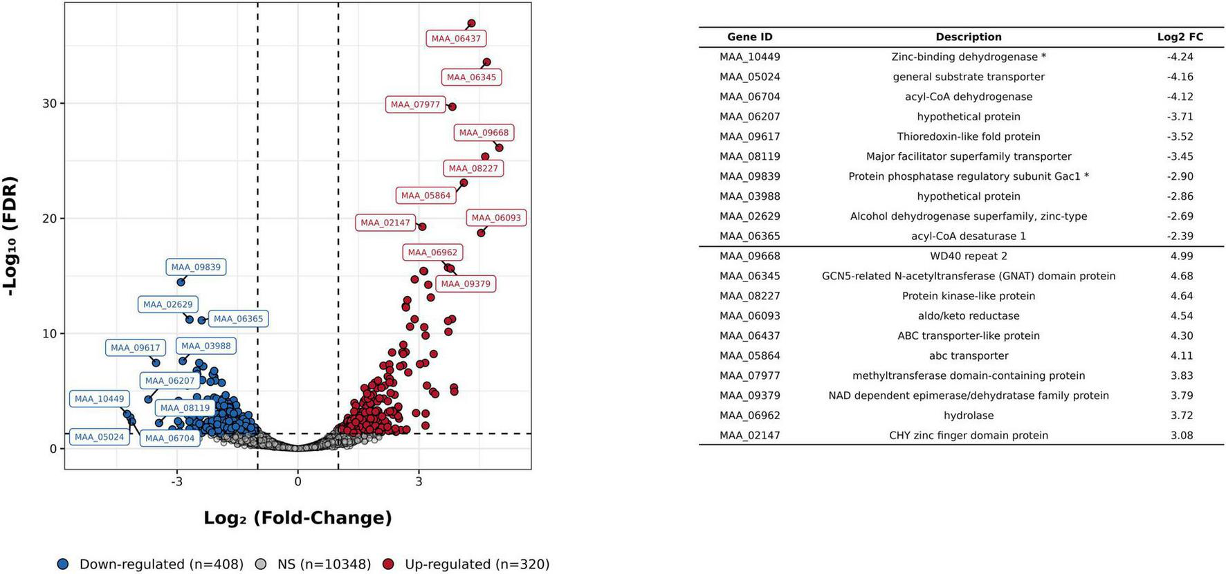 To complement these gene set enrichment analyses, we further inspected the functional annotations of the DEGs. This process allowed us to identify genes of interest related to fungal virulence, the production of secondary metabolites, and DNA repair mechanisms associated with UV damage. The following paragraphs provide a detailed description of the main DEGs involved in these biological processes.
