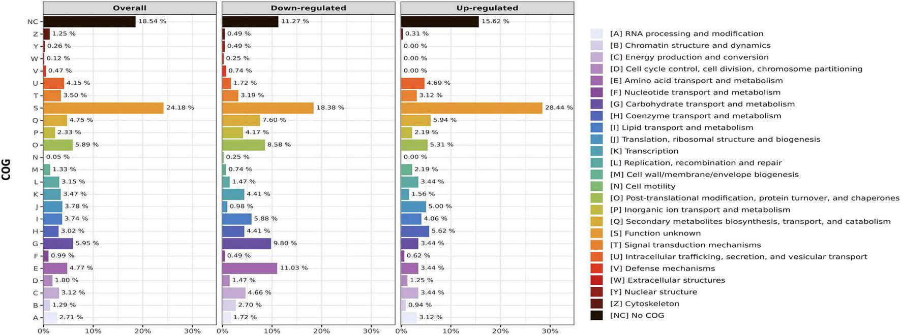To investigate the overall patterns of gene function amongst DEGs after the UV-B exposure in M. pingshaense blastospores, a gene set enrichment analysis of the main biological processes, cell components, and molecular function was performed using the clusters of orthologous groups (COG) and gene ontology (GO). The functional classification of DEGs reveals that 88.72% (362/408) of the down-regulated and 84.37% (270/320) of the upregulated genes could be assigned to at least one of the COG categories. However, 18.38% (75/408) of the down-regulated genes and 28.44% (91/320) of the upregulated genes had an unknown function. The categories with the highest number of down-regulated genes were: “[E] Amino acid transport and metabolism” (11.03%), “[G] Carbohydrate transport and metabolism” (9.80%), and “[O] Post-translational modification, protein turnover, and chaperones” (8.58%). For those upregulated, the main categories were: “[Q] Secondary metabolites biosynthesis, transport, and catabolism” (5.94%), “[H] Coenzyme transport and metabolism” (5.62%), and “[O] Post-translational modification, protein turnover, and chaperones” (5.31%) (Figure 4).