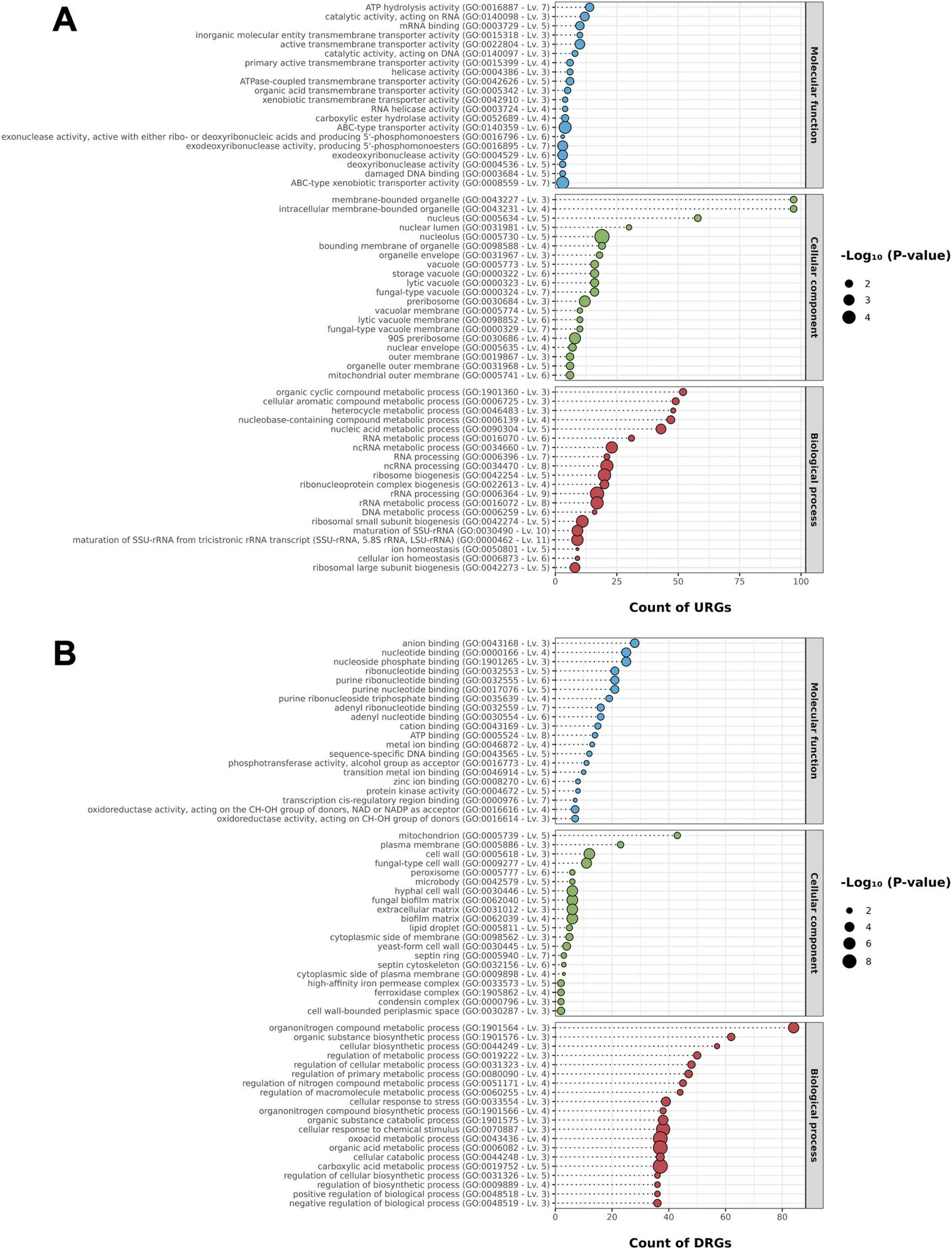 Enrichment analysis of gene ontology (GO) Terms of (A) up- and (B) down-regulated genes of Metarhizium pingshaense blastospores after UV-B exposure. The percentages of differentially expressed genes in the ten most expressive terms of each functional category.