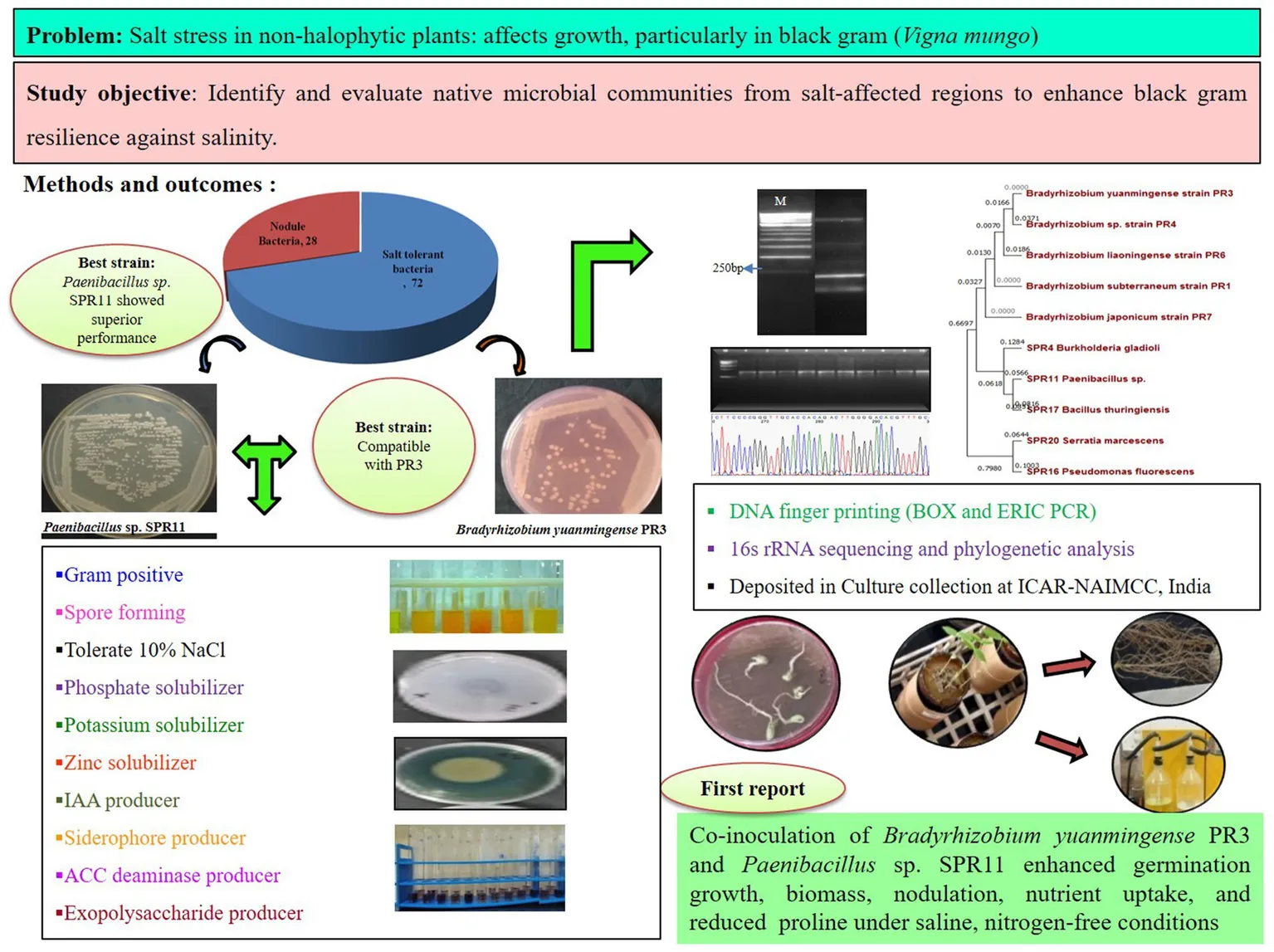 Soil salinity represents a significant challenge to agriculture worldwide, affecting approximately 1,125 million hectares globally, including 6.73 million hectares in India (Mishra et al., 2023). In India, around 2.5 million hectares are impacted by soil salinity and alkalinity, with approximately 1.2 million hectares located in Uttar Pradesh. This includes the districts of the Ganga-Yamuna and Ganga-Gomti doab regions, particularly in Eastern U.P., where soil degradation is most pronounced (Priyadarshi and Yadav, 2023). This problem hampers crop productivity and threatens food security, particularly in areas with little rainfall, high temperatures, poor irrigation, and heavy use of chemical fertilizers (Raza et al., 2019; Kumar and Sharma, 2020). The black gram is one of the important pulse crop crops, severely affected by the soil salinity and makes up to 11% of India’s total pulse production, which was 25.46 million tons in 2020–2021 (Agricultural Statistics Division, Ministry of Agriculture and Farmers’ Welfare, India, 2022). Though India is the major producer and consumer of black gram, the high salinity in the soil reduces its yield and makes it hard to meet the local demand. Hence, it is crucial to find an economical and sustainable solution to deal with salinity to improve black gram production and ensure food security in India (Atta et al., 2023). Nitrogen fixation in leguminous crops is significantly impaired when exposed to a salinity level of up to 6 dS m−1. The elevated levels of Na+ and Cl− in the roots and shoots can lead to disruptions in osmotic balance, adversely affecting the plant’s metabolic pathways, leading to lower crop yields and reduced levels of leghemoglobin in the nodules and overall health (Goyal and Habtewold, 2023; Comba et al., 1998; Ali et al., 2023; Guinel, 2015; Reid et al., 2017). Nitrogen, a vital element for the development of all plant structures, serves as a critical component of chlorophyll, enzymes, and proteins, and is required in larger quantities than most other plant nutrients (Sabagh et al., 2020). Leguminous crops naturally meet their nitrogen requirements through a symbiotic relationship with nitrogen-fixing bacteria (Bhattacharjee et al., 2008; Castro et al., 2016; Babalola et al., 2017; Kawaka, 2022). Despite this inherent advantage, chemical fertilizer usage remains high in India. In the 2022–2023 period, India consumed 35.73 million metric tons of urea and 10.53 million metric tons of DAP, according to sales data from DBT India (Song et al., 2019). Research suggests that co-inoculating legumes with salt-tolerant soil bacteria, in combination with rhizobia, is a sustainable approach to enhance nitrogen availability through nitrogen fixation and improve the productivity of leguminous crops in saline soil. This method proves more effective than using a single rhizobium (Ahmad et al., 2011; Nitawaki et al., 2021). The nature-friendly bacteria can contribute to improved plant growth through several direct mechanisms viz. solubilization of phosphate, production of indole acetic acid (IAA), exopolysaccharides (EPS), siderophores, ammonia, ACC deaminase, antioxidants as well as fixation of nitrogen. They also enhance growth indirectly by providing antagonistic effects and inducing systemic resistance (Upadhyay et al., 2011; Chandran et al., 2021). PGP bacteria enhance the plant growth by up-regulating the production of Na+/K+ ion channel proteins, hence facilitating ionic balancing and enhancing plant resilience under saltwater conditions (Egamberdieva et al., 2019). They also help to protect plants from diseases in both normal and salty conditions (Mahgoub et al., 2021). Certain PGP bacteria such as Bacillus, Enterobacter sp., Pseudomonas sp., Arthrobacter sp., Azotobacter sp., Azospirillum sp., Serratia sp. and Rhizobia, have displayed promising responses in helping the plants to tolerate salt, superior by reducing the adverse consequences of salinity and alkalinity (Hussain et al., 2020; John et al., 2023). Furthermore, the study has shown that Paenibacillus strains are capable of surviving salt stress at a level of up to 15% NaCl and possess advantageous characteristics such as solubilization of phosphorus, production of siderophore and IAA (Gopal and Anandham, 2020). Combining PGPR strains that produce ACC deaminase with rhizobial strains can significantly improve salt tolerance, growth, and nodulation in various crops under saline conditions (Ahmad et al., 2011; Chandran et al., 2021; Win et al., 2023). Therefore, the research aimed to evaluate the efficacy of “salt-tolerant plant growth-promoting strains” derived from saline soils in enhancing plant growth, nitrogen uptake and nodulation under salt stress. The most effective strain, Paenibacillus sp. SPR11 was chosen based on salt- tolerance, biochemical potential, in vitro plant growth-promoting (PGP) characteristics, compatibility, DNA fingerprinting, and 16S rRNA gene sequencing analysis. A seed germination test and Leneord jar experiment were then conducted to assess how co-inoculating SPR11 and PR3 affect plant growth and nodulation in black gram underneath nitrogen-free saline conditions.