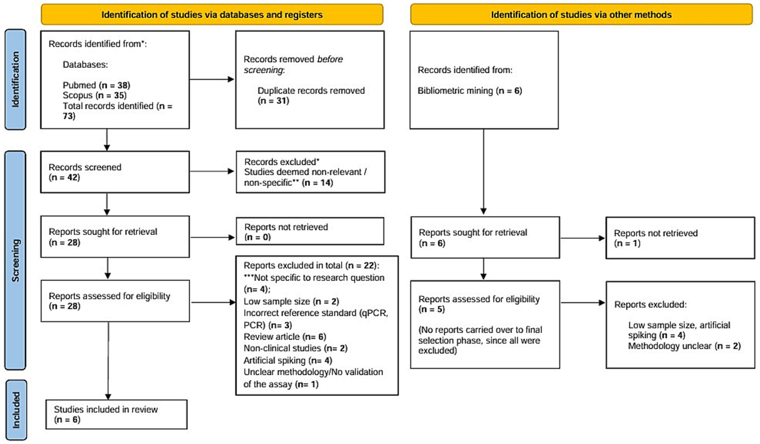A total of 73 articles were identified through preliminary database searching on PubMed and Scopus, of which 28 studies were retrieved in full text to assess for eligibility against the inclusion criteria. Studies non-specific to the research question (n = 14) and duplicates (n = 31) were eliminated, and a total of 22 studies were disqualified due to low sample size (n = 2), artificial spiking (n = 4), usage of reference test other than gold standard (n = 3), review articles (n = 6), non-clinical studies (n = 2), unclear methodology or improper validation of the assay (n = 1), and non-specificity to the research question (n = 4). Parallelly, bibliometric mining yielded six studies in addition to the traditional database searching, of which none were selected for the final round of review. A total of 28 studies underwent final screening and selection, of which 6 studies were included as a part of this systematic review and meta-analysis. A detailed figure pertaining to the selection and screening phase of the review is pictorially depicted in accordance with Preferred Reporting Items for Systematic Reviews and Meta-Analyses (PRISMA) 2020 flowchart (Figure 1).