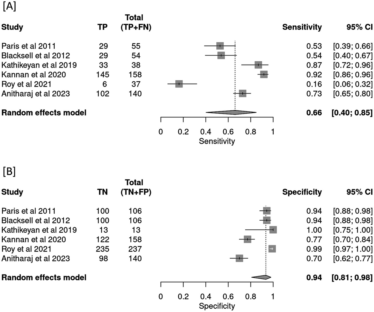 Figure 3. Forest plot depicting pooled effect estimates of (A) sensitivity and (B) specificity in the meta-analysis.