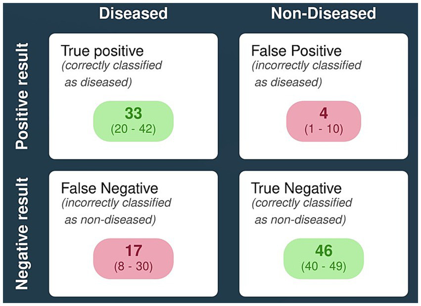 Figure 5. Pictorial representation of diagnostic performance of LAMP for detecting scrub typhus using a hypothetical population model. [Note: proxy prevalence of scrub typhus is taken to be ~50%; n = 100].