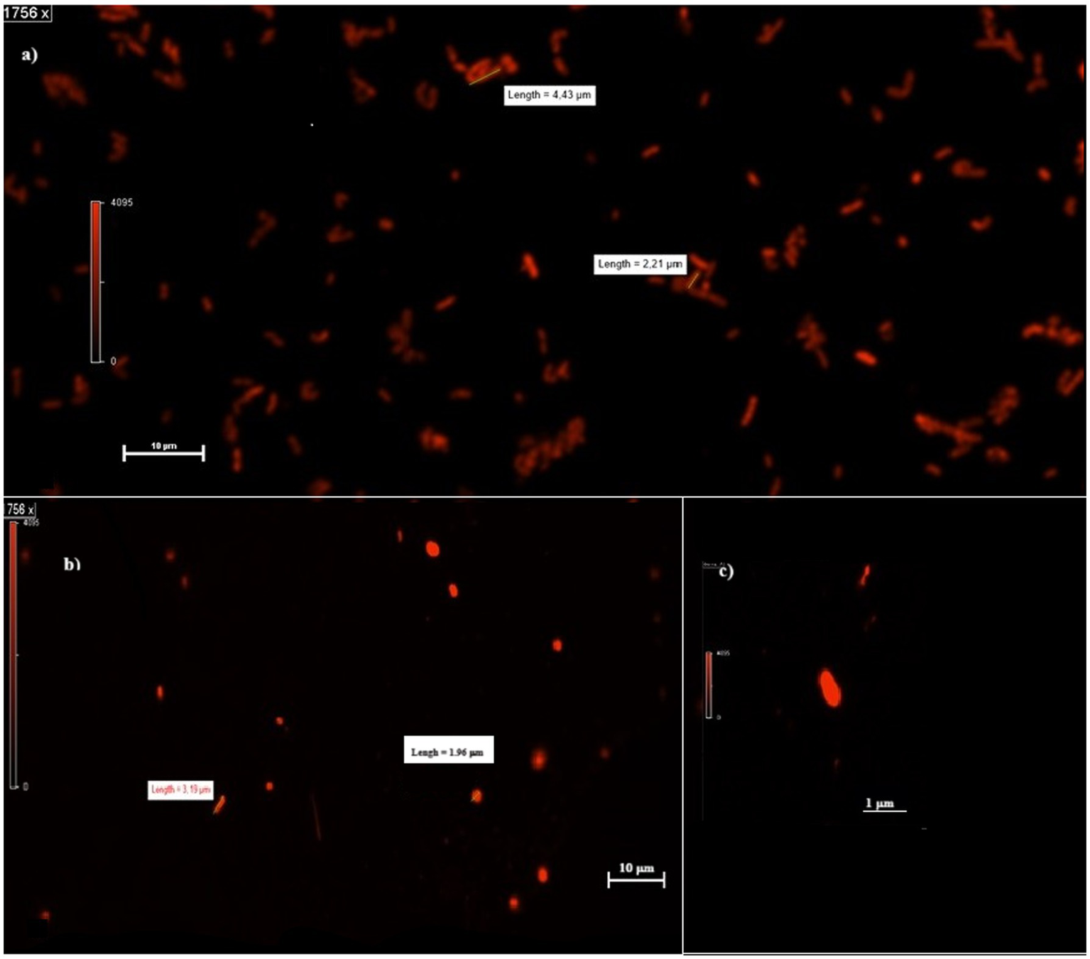 Figure 2. Planktonic cells in MFCs and MECs. (A,B) Shape and dimension of cells in MFCs (A) and MECs (B) catholytes. (C) MEC single-cell shape at higher magnification (3,512 x).
