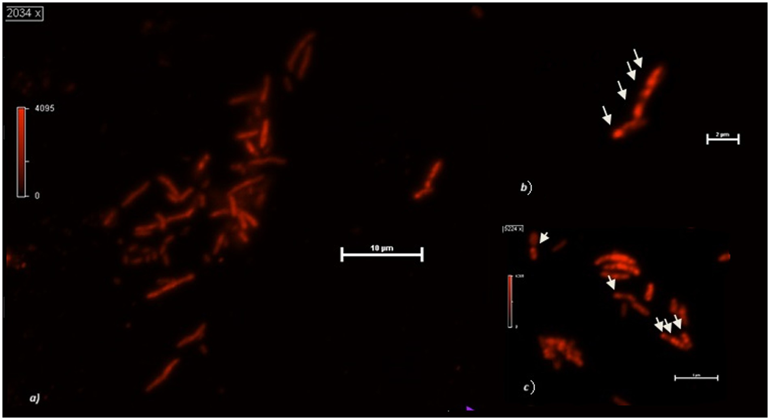 Figure 3. (A) Cupriavidus necator cells growing at the cathode of an MFC using 0.5% HCO3−. (B) Detail of two cells with PHB granules. (C) PHB granules in MFCs planktonic cells after 48 h operation with 0.5% HCO3−. The arrows indicate the intracellular granules.