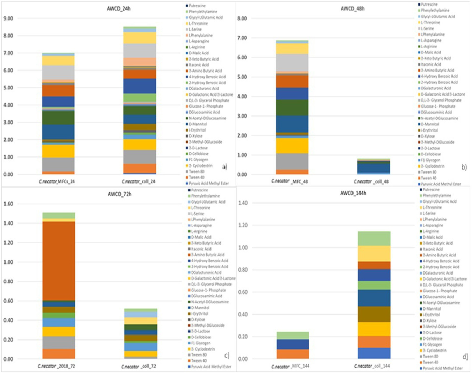 As previously stated, during the whole experimental activity, we used an ALE approach to investigate the behavior of the chosen microorganisms after continuous and prolonged use of MFCs. Starting from the preparation of preformed biofilm and during all cycles of experiments, once we ended an experimental session and before disassembling our systems, we isolated bacteria from both analytes and catholytes of MFCs as well as from control cultures. We have used them in further experiments, as previously described and also reported in Nastro et al. (2023). As a result, the original lyophilized strain was used to prepare just the biofilms and cultures for the first test for direct CO2 capture from the gas mix. We use ECOPLATE tests (BIOLOG) for the physiological profiling (CLPP) of C. necator at the beginning and at the end of the whole experimental activities and effectively distinguish any changes in its metabolism. BIOLOG ECO microplates contain 31 different carbon substrates that are classified into six categories: carbohydrates, carboxylic acids, amino acids, phenolic compounds, polymers, and amines/amides and, for this reason, it is particularly useful to assay Carbon Source Utilization Patterns (CSUP) for single strains and microbial communities, which can change in consequence to a change in the environmental conditions of their growth such as the exposition to a toxic compound or the availability of carbon sources (Martínez-Toledo et al., 2021). Briefly, after collecting the results of chemical analyses and BESs monitoring, we isolated C. necator from the cathode of one of the MFCs replica of the last round of experiments and prepared a suspension of 0.2 McFarland in NaCl 0.9% solution and inoculated it in an ECOLOG 96-multiwell plate (BIOLOG), sealed in a plastic bag with wet paper sheets, and incubated at 30°C for 72 h. The same procedure was followed for the strain from the original liophylized culture. We measured the absorbance of the ECOLOG plates after 24, 48,72 and 144 h at 590 nm by a Clariostar Multimode Microplate Reader (ThermoFisher). From the results from the Clariostar, we calculated the average well-color development (AWCD) as a measure of the overall metabolic activity of microorganisms, grown in the presence of each test substrate (Nastro et al., 2023).