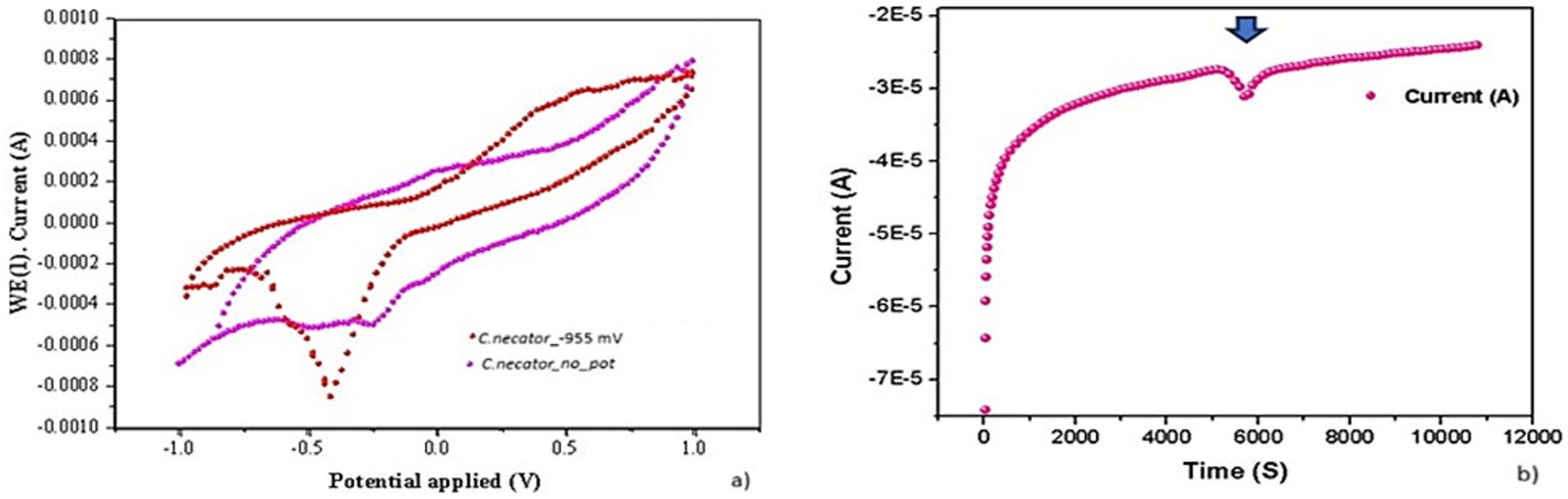 Figure 6. Cupriavidus necator DM428 biofilm after the application of −955 mV for 48 h (CV: 1 mV/s). (A) C. necator dm428 biofilm with no external potential applied (CV: −1 V: +1 V – 1 mV/s). C. necator dm428 sterile supernatant (0.22 mm pore filter) from +1,5 V MFC (CV: −1 V: +0 V – 1 mV/s). (B) Chronoamperometry of C. necator dm428 grown in the presence (4a) of −955 mV potential vs. Ag/AgCl (4a). The arrow indicates a peak of negative current appeared after 5,800 s.