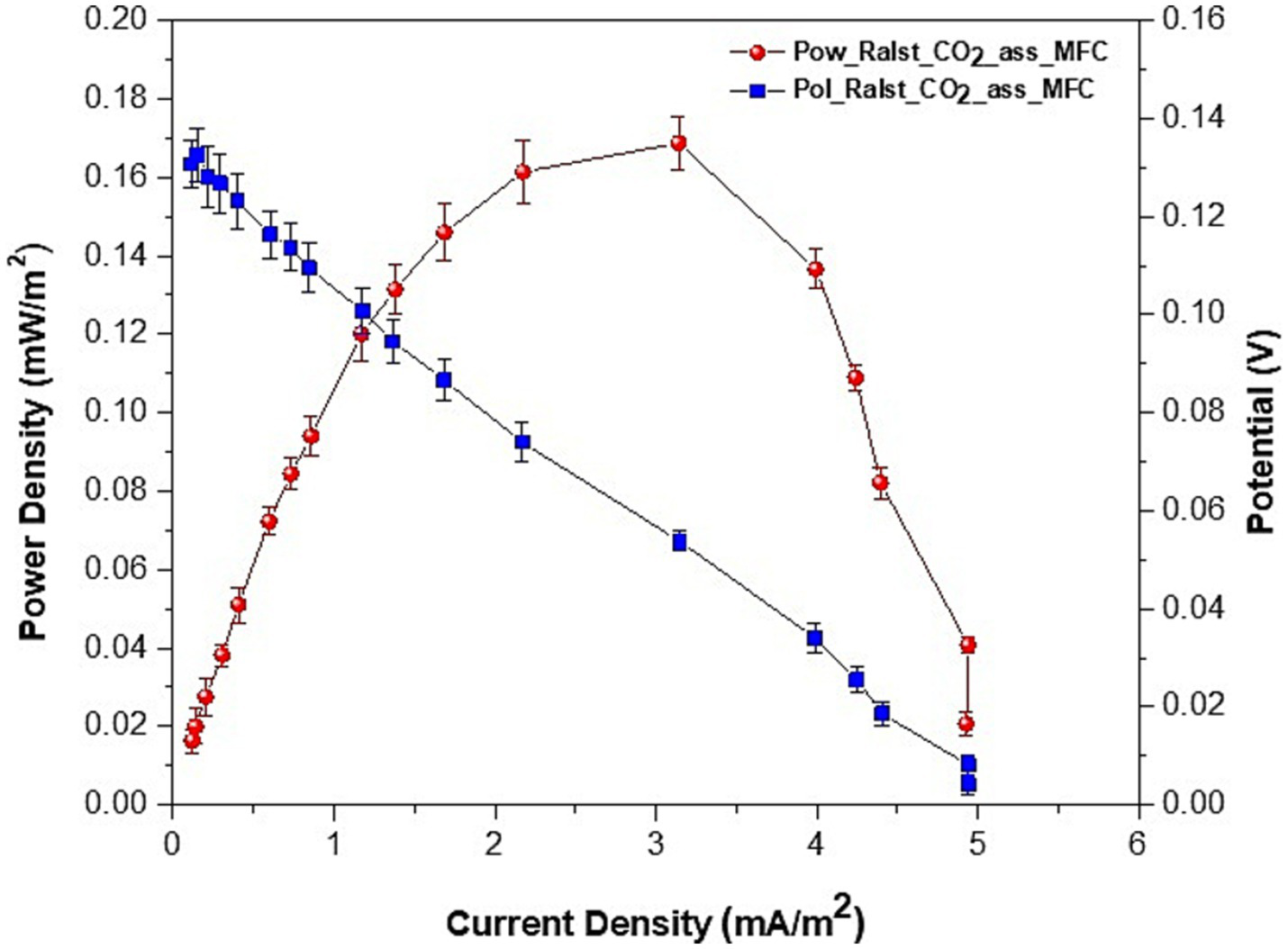 Without a preformed biofilm, the MFC_no_biofilm did not polarize properly and started reverting at an external load of 22,000 Ω. When we used the DSMZ original strain and connected the MFC_coll to 1,000 Ω, we obtained an average current of 1.36 mA/m2 (lower than the 2.0 mA/m2 measured in the same conditions when using previously used isolates in MFC_no_biofilm) and a maximum power density of 0.153 mW/m2 at 18000 Ω. However, as previously said, also MFC_coll started reverting to lower values of applied external resistance and after being connected to the 1,000 Ω external resistor for less than 30 min, both MFC_no_biofim and MFC_coll switched to negative voltage values. Therefore, our results seem to confirm the important role of both biofilm maturity and cell metabolic adaptation in the stability of MFCs for CO2 biocapture.