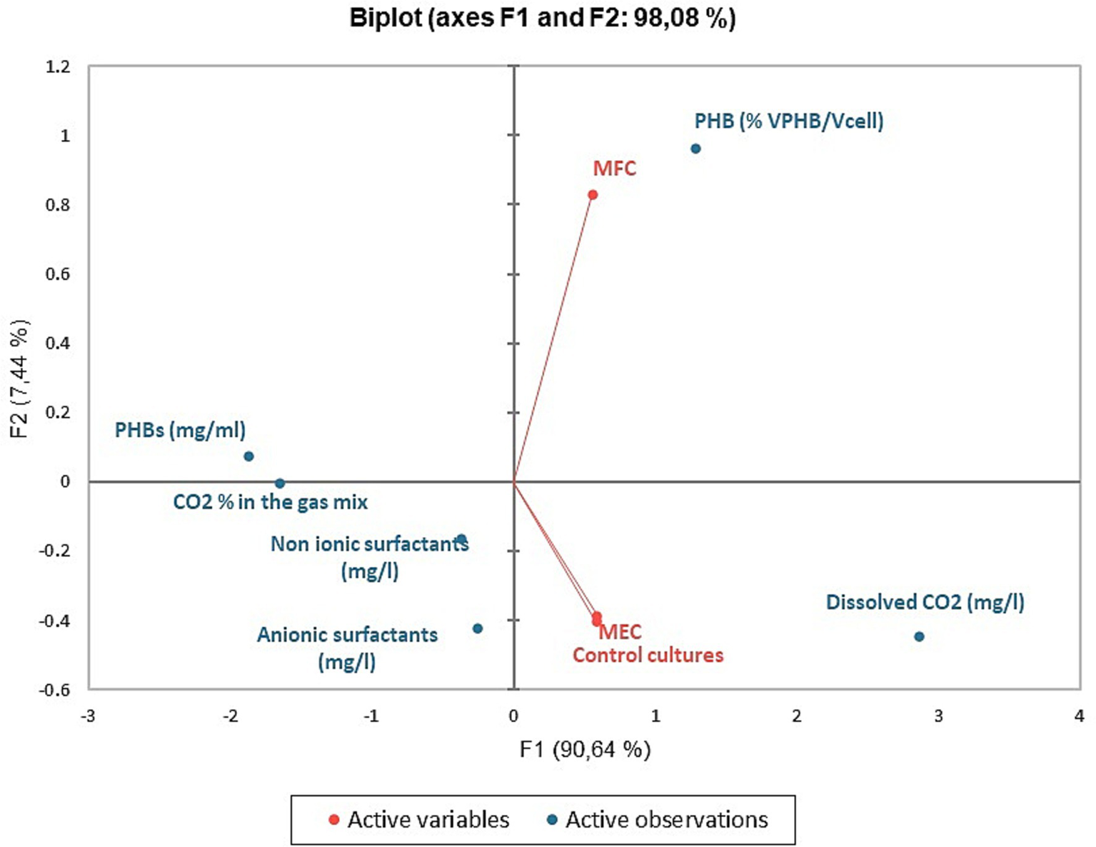 Figure 8. PCA analyses: biplot representing the active variables (MFCs, MECs, and control cultures) and the concentration of metabolites and CO2 in the media and its percentage in the gas mix.