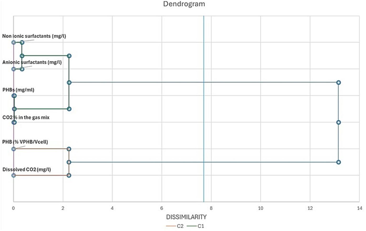Figure 9. Dendrogram of metabolites, CO2 removal from the gas mix, PHBs granule volume and dissolved CO2 in C. necator growth medium. The parameters are arranged on the basis of their dissimilarity at α = 0.05.