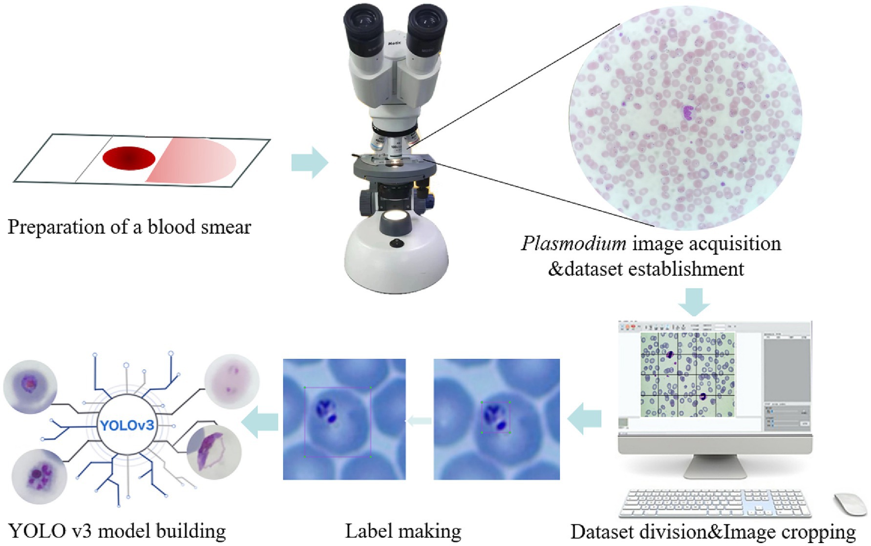 Figure 1. Schematic illustration of the recognition platform of Plasmodium falciparum via YOLO v3. The thin blood smears were scanned into Plasmodium falciparum images under a microscope, then the images were cropped and classified to establish a database, labels were created for each iRBC, and the YOLO v3 model was established.