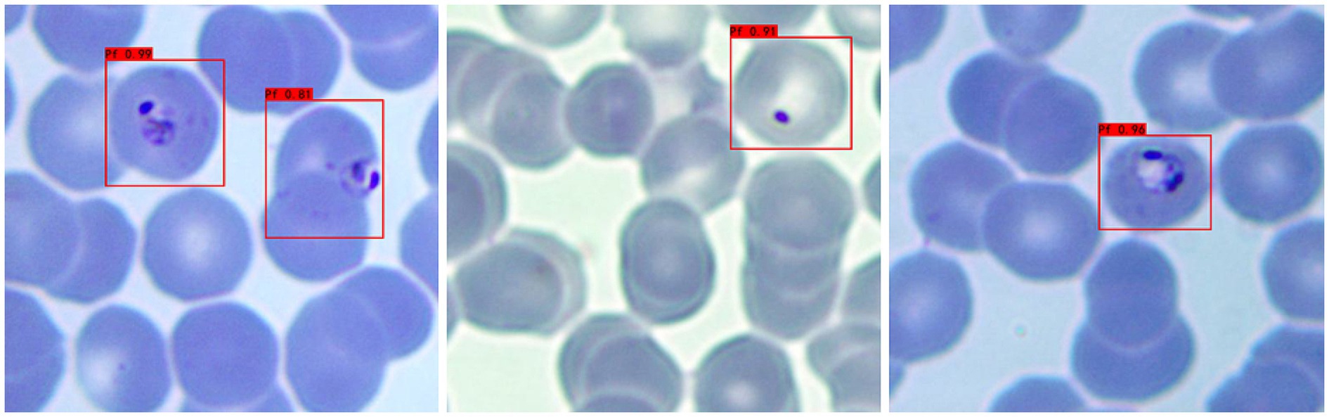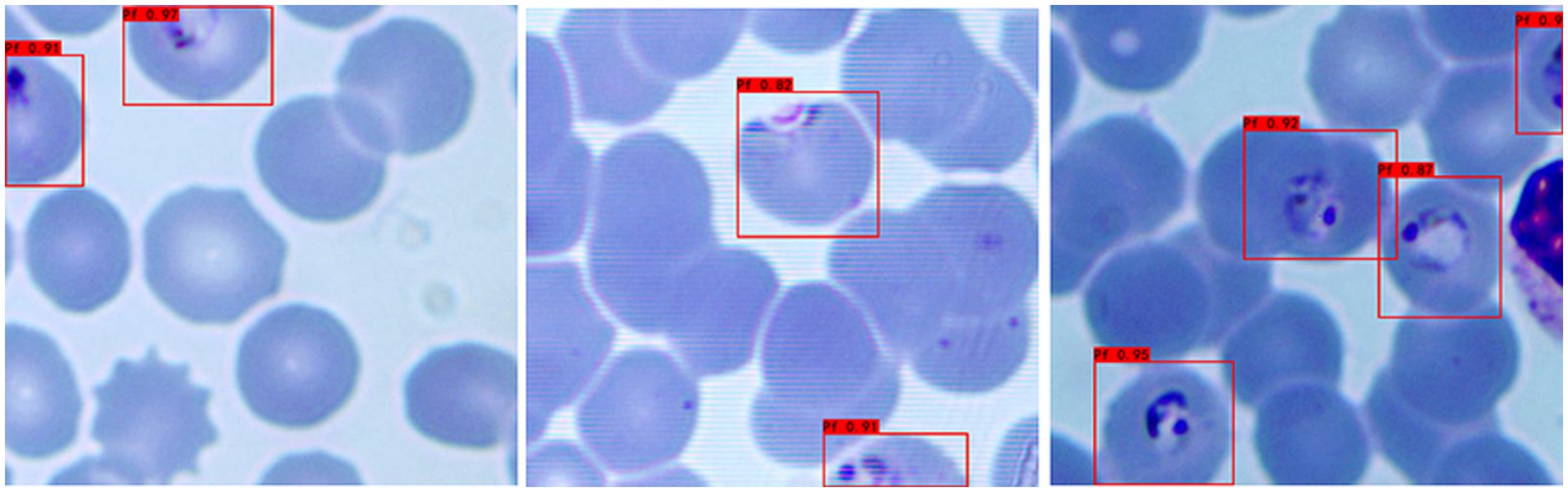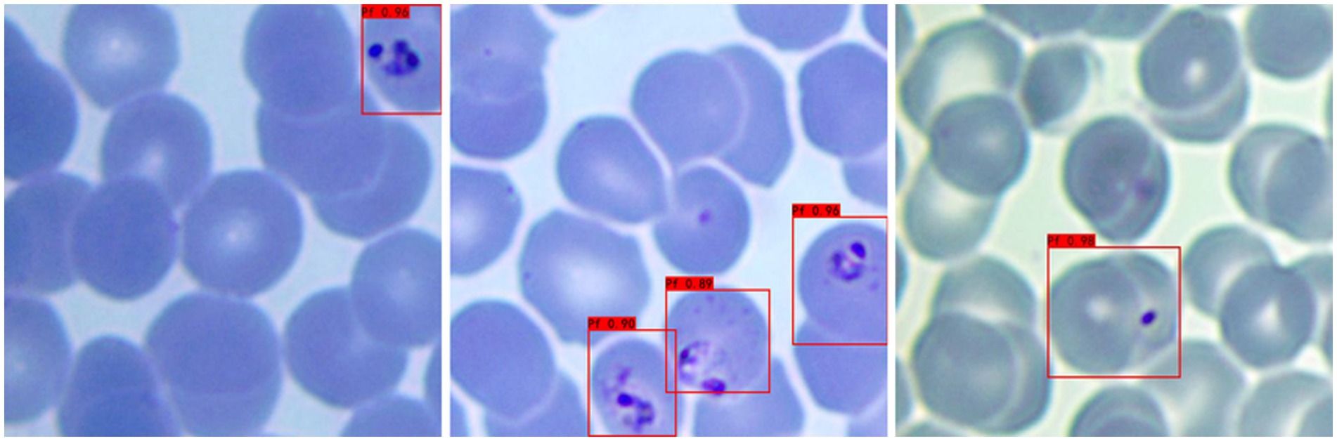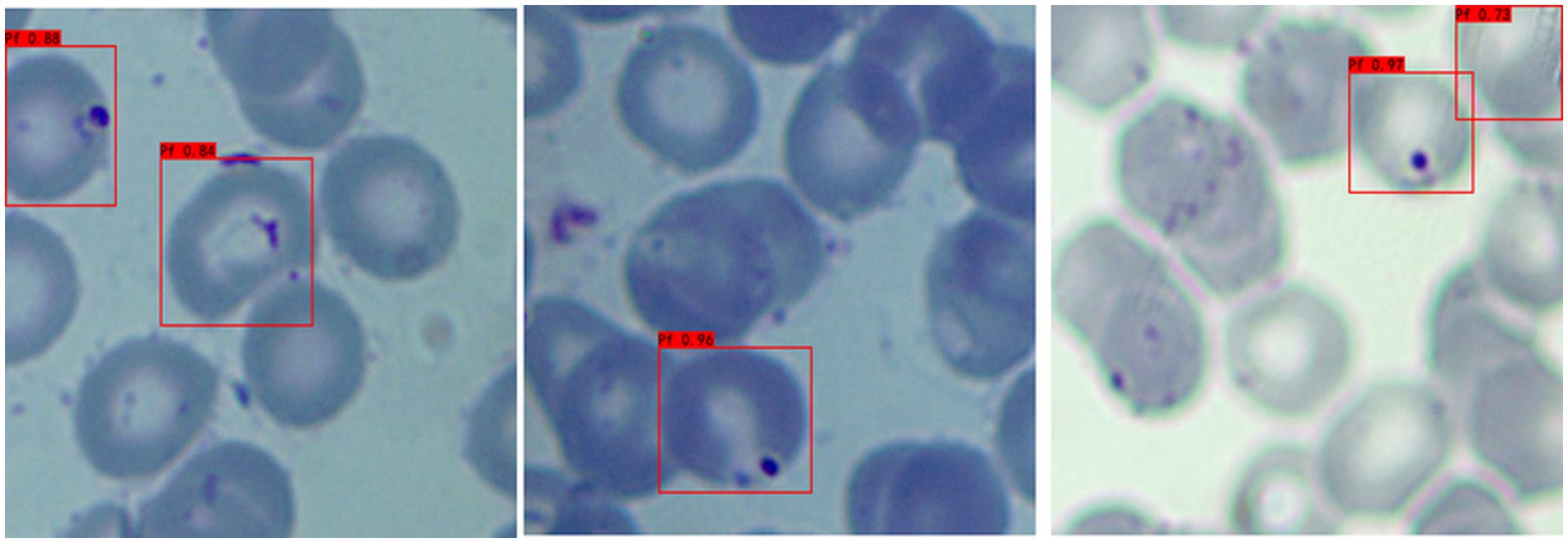 Figure 2. Recognition results of Plasmodium falciparum parasites under different backgrounds by YOLOv3.