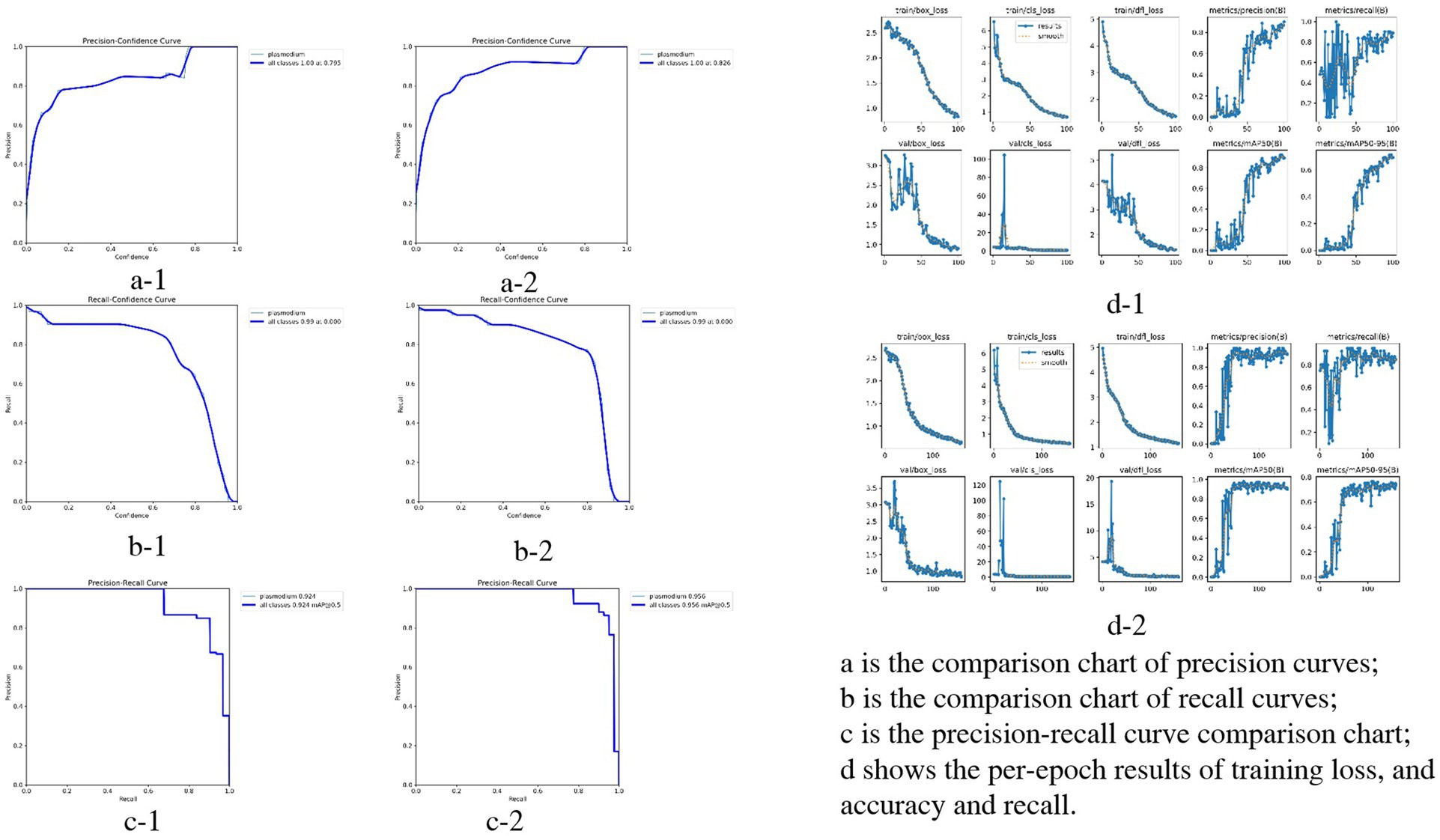 Compared with the initial test, the optimized model showed significant improvements in all performance metrics. Detailed comparisons between the two test groups (initial test: a-1, b-1, c-1, d-1; optimized test: a-2, b-2, c-2, d-2) are presented in Figure 6.
