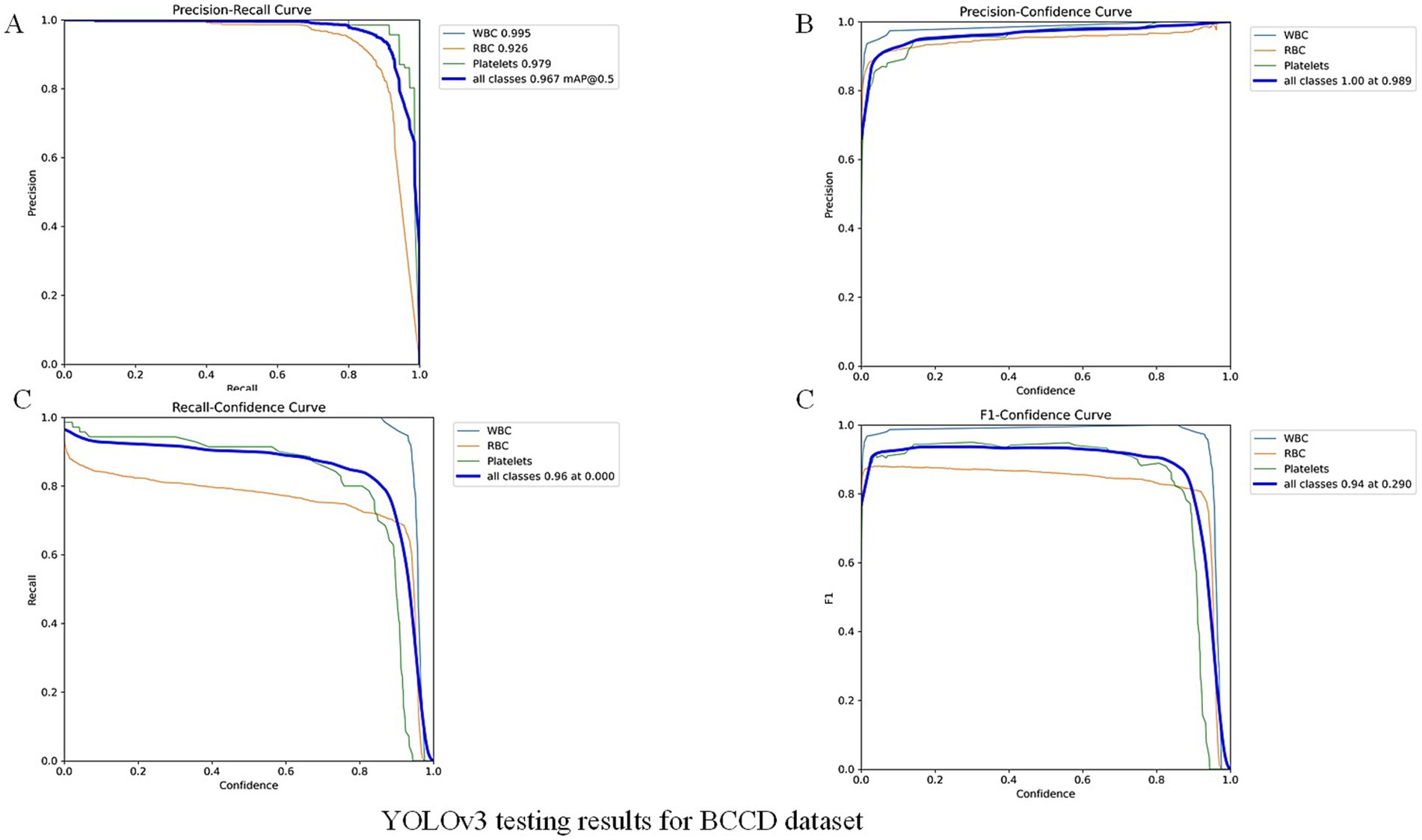 3 Demonstration of Excellent Generalization Ability and Clinical Relevance through Cross-Dataset Validation: To further validate the model’s robustness and generalization ability, we applied the model trained on our clinical thin blood smear dataset, without any additional fine-tuning, to the general BCCD dataset. On this dataset, our YOLOv3 model achieved excellent performance with mAP of 96.7%, Precision of 100%, Recall of 96%, and F1 of 94%. This result holds dual significance: