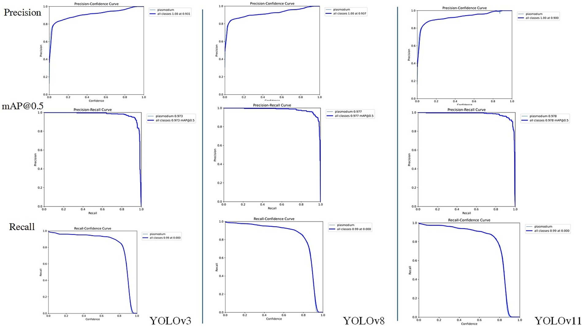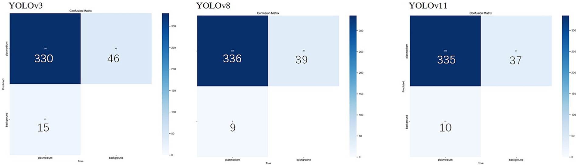 Through comparison, on the same clinical thin blood smear dataset, YOLOv8 and YOLOv11 achieved mAP@0.5 scores of 0.977 and 0.978 respectively, showing slight improvements over YOLOv3’s 0.973. The enhancement in precision metrics (2–3%) was particularly significant, reflecting the new models’ advantages in reducing false detections. However, the recall rates of the new models (0.918 and 0.912) were lower than YOLOv3 (0.943), indicating that while maintaining high precision, they may sacrifice the detection rate of some parasites. Confusion matrix analysis revealed that YOLOv8 and YOLOv11 had zero missed detections, but their false detection counts were significantly higher than YOLOv3, suggesting increased sensitivity to non-parasitic structures in complex backgrounds. Notably, compared to YOLOv3, the new generation models reduced parameter count and computational load by nearly 90%, significantly improving inference speed and deployment flexibility while maintaining accuracy. This balance between performance and efficiency provides crucial technical support for promoting microscopic image detection in resource-constrained medical environments.