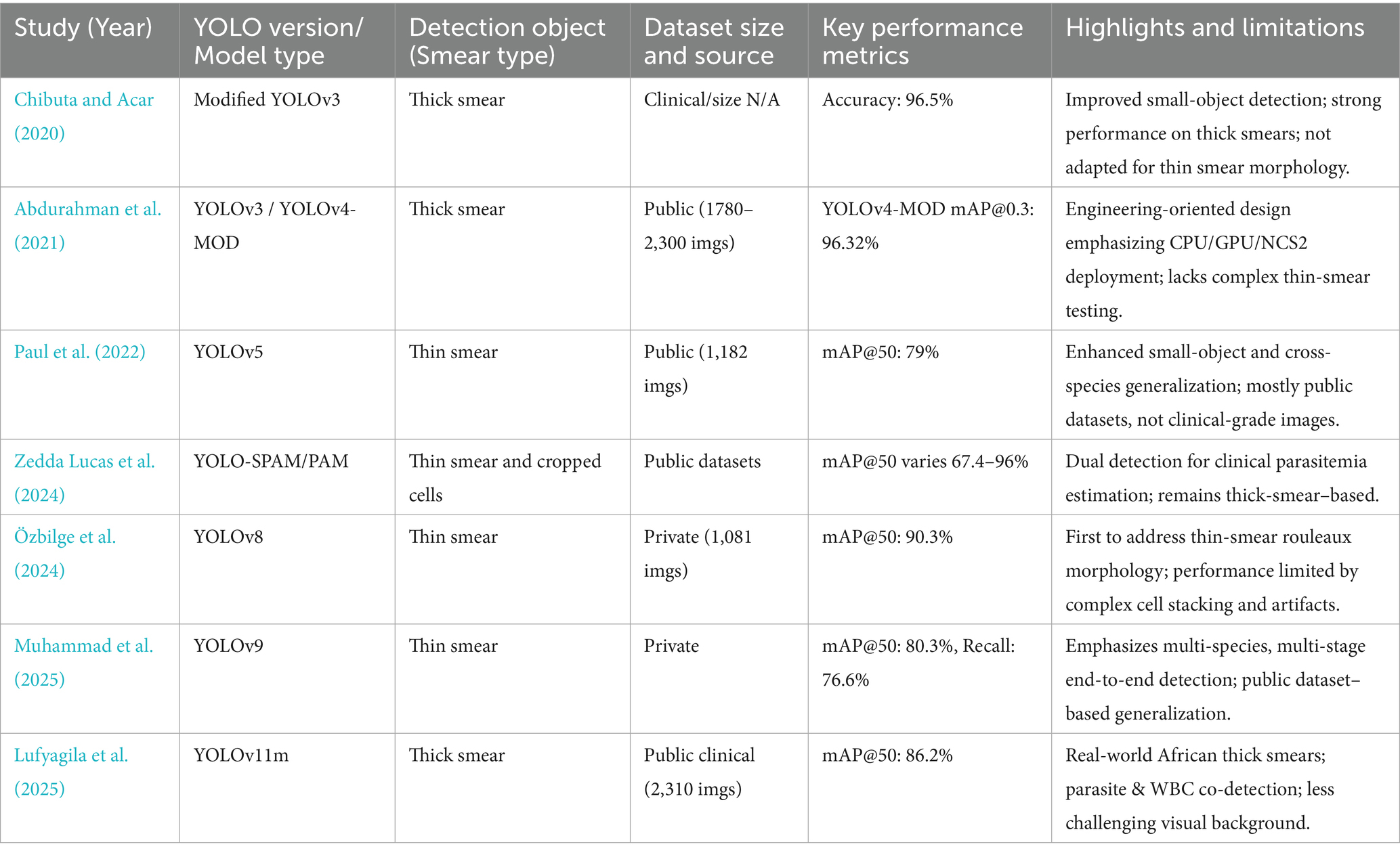 Compared with other thin smear detection studies, Yang et al. (2020) achieved 93.46% accuracy for malaria parasite detection, while Hung et al. (2020) reported 98% accuracy using computationally expensive cascaded Faster R-CNN with AlexNet for P. vivax, where parasitic objects are larger than P. falciparum. Muhammad et al. (2025) reported mAP 80.3% based on YOLOv8 with public datasets and Lufyagila et al. (2025) get mAP 86.2% based on public clinical images. Our 94.41% accuracy for P. falciparum in thin clinical smears represents robust performance for this challenging task while maintaining real-time inference speeds suitable for resource-constrained clinical environments. Meanwhile, we have conducted an extensive review of recent deep learning-based malaria detection research, particularly those employing YOLO and related techniques. The key findings are summarized in Table 1.
