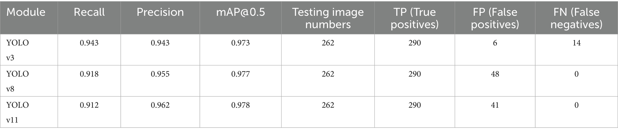 Considering the YOLO series of object detection algorithms have undergone several significant iterations and performance improvements. To further verify the continued superiority of the YOLO series in the field of microscopic image recognition and to investigate its technological development trends, we conducted additional comparative experiments using the same dataset as in this study’s YOLOv3 experiments (selected from 2,613 optimized training images), based on the YOLOv8 and YOLOv11 models. The test results are shown in Figures 8, 9. The comparation results in showed in Table 2.