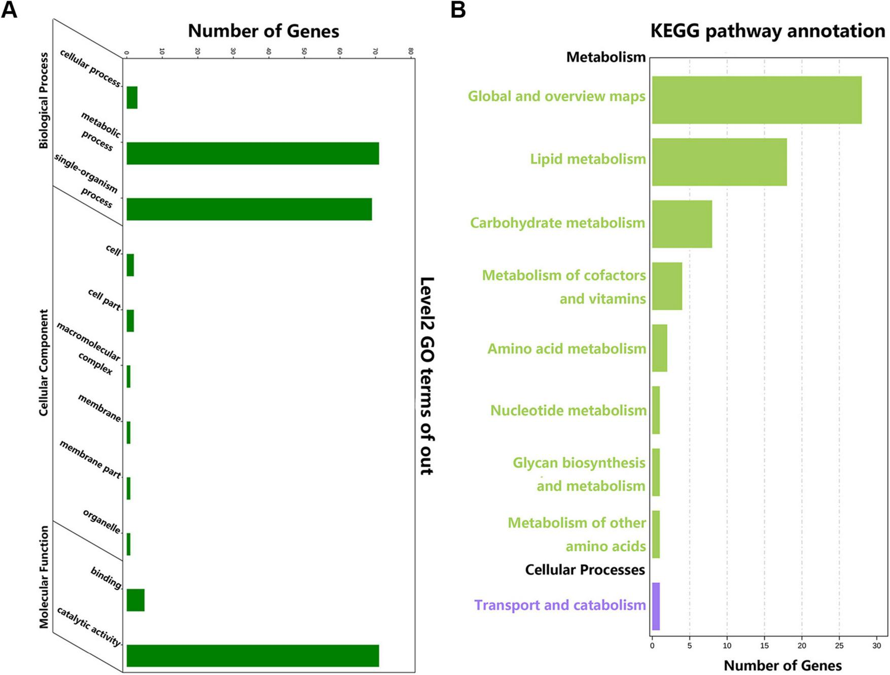 We successfully annotated 180 ApSDRs into GO categories (Figure 2A). These ApSDRs were enriched in “metabolic process” (GO:0008152), “single-organism process” (GO:0044699), and “catalytic activity” (GO:0003824). As shown in Figure 2B, analysis of 180 ApSDRs KEGG-enriched pathways revealed that ApSDRs were mainly enriched in KEGG-enriched pathways such as global and overview maps, lipid metabolism, carbohydrate metabolism, and metabolism of cofactors and vitamins.