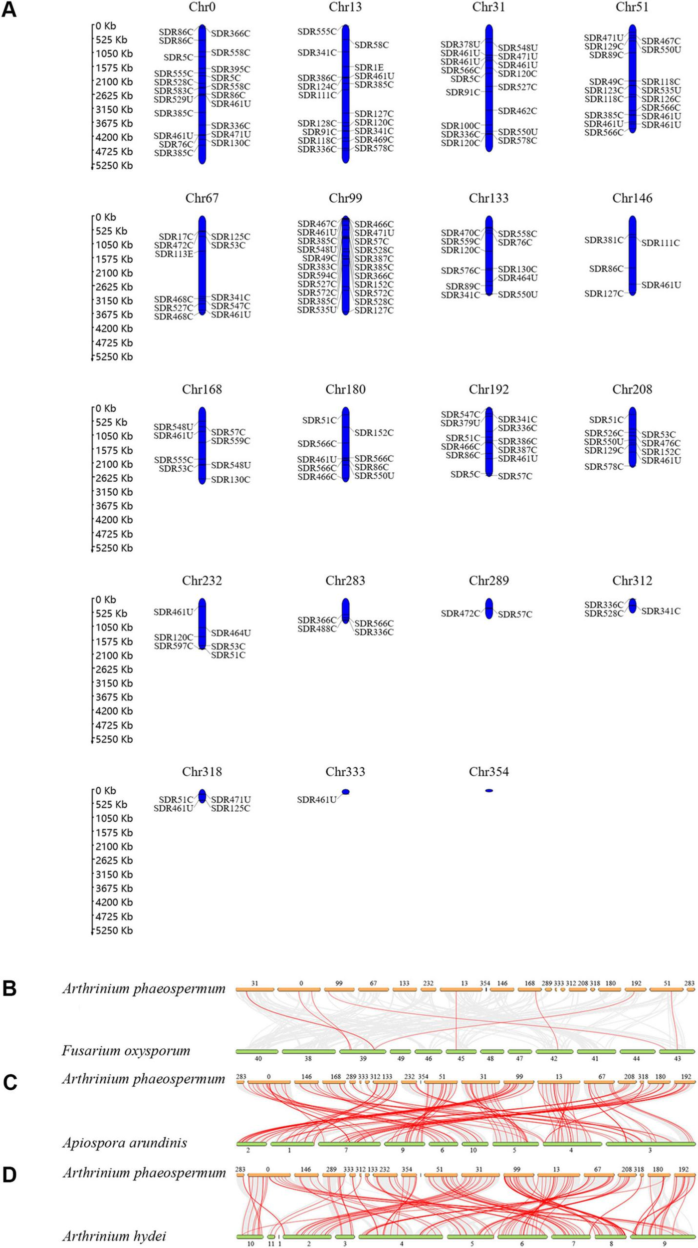 (A) Distribution of SDRs in the chromosomes of A. phaeospermum. (B–D) The orthologous relationship of SDRs between A. phaeospermum and F. oxysporum, A. arundinis, or A. hydei. Gray lines indicate gene pairs that are co-linear between the two species. Red lines indicate homologous SDR gene pairs between the two species.