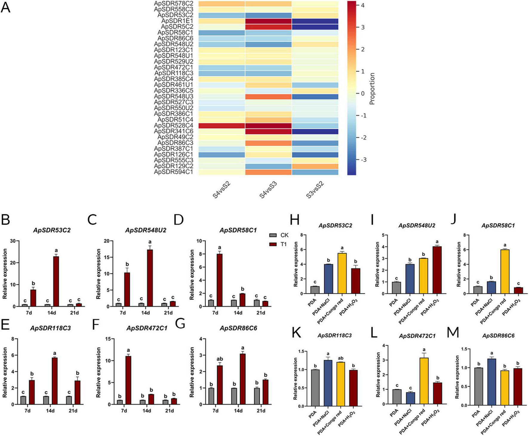(A) Heatmap of the top 30 expressed ApSDRs in the transcriptome sequencing data. Proportion represents the log2 value of the fold change in the expression of ApSDRs between different periods. Red represents an up-regulation of gene expression and blue represents a decrease in gene expression. The rows represent transcription units. (B–G) Expression levels of the six candidate ApSDRs at different infestation times were determined by qPCR. Tubulin from A. phaeospermum was used as an internal reference gene. CK: A. phaeospermum inoculated in a PDA medium coated with 200 μL of sterile deionized water. T1: A. phaeospermum inoculated in a PDA medium coated with 200 μL of sterile hybrid bamboo tissue fluid. (H–M) Expression levels of the six candidate ApSDRs under stress conditions were determined by qPCR. Tubulin from A. phaeospermum was used as an internal reference gene. There are significant differences in the relative expression of different lowercase letters (p < 0.05).