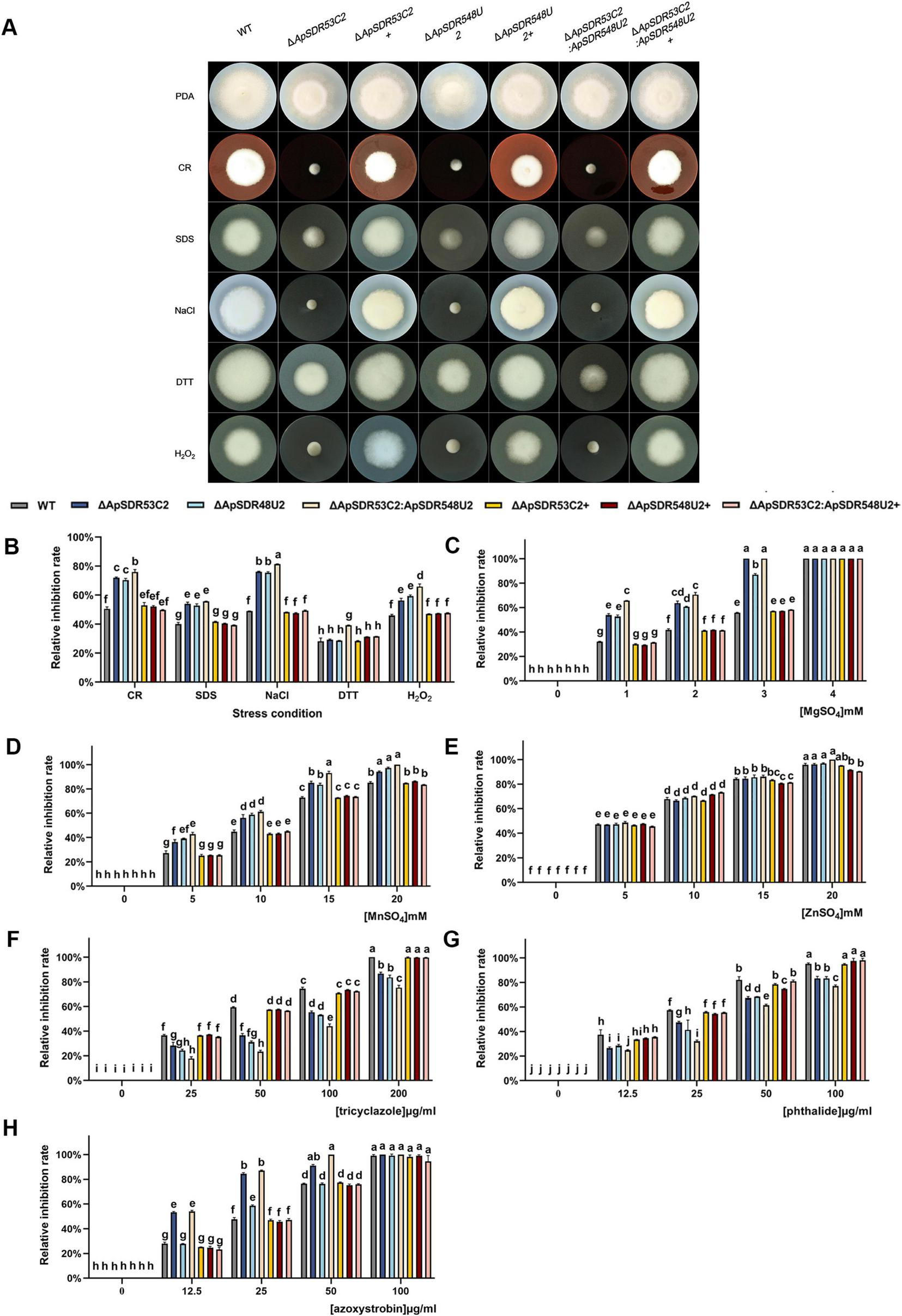 Differences among wild-type (WT), deletion mutant, and back mutant strains under different stresses. (A) Comparison of colony morphology and resistance of WT, deletion mutant, and backfill mutant strains. Note: Inoculation of WT, deletion mutants (ΔApSDR53C2, ΔApSDR548U2, and ΔApSDR53C2:ApSDR548U2), and back-complementary mutants (ΔApSDR53C2+, ΔApSDR548U2+, and ΔApSDR53C2:ApSDR548U2+) was carried out in PDA medium or PDA medium supplemented with various stressors for 5 days at 25°C. (B–H) Bar graphs showing WT, deletion mutant, and backfill mutant strains in the relative inhibition rates after 5 days of growth on PDA mediums supplemented with stress reagents (CR, SDS, NaCl, DTT, and H2O2), heavy metals (Mg2+, Mn2+, and Zn2+), and fungicides (tricyclazole, phthalide, and azoxystrobin). There are significant differences in the relative inhibition of different lowercase letters (p < 0.05).