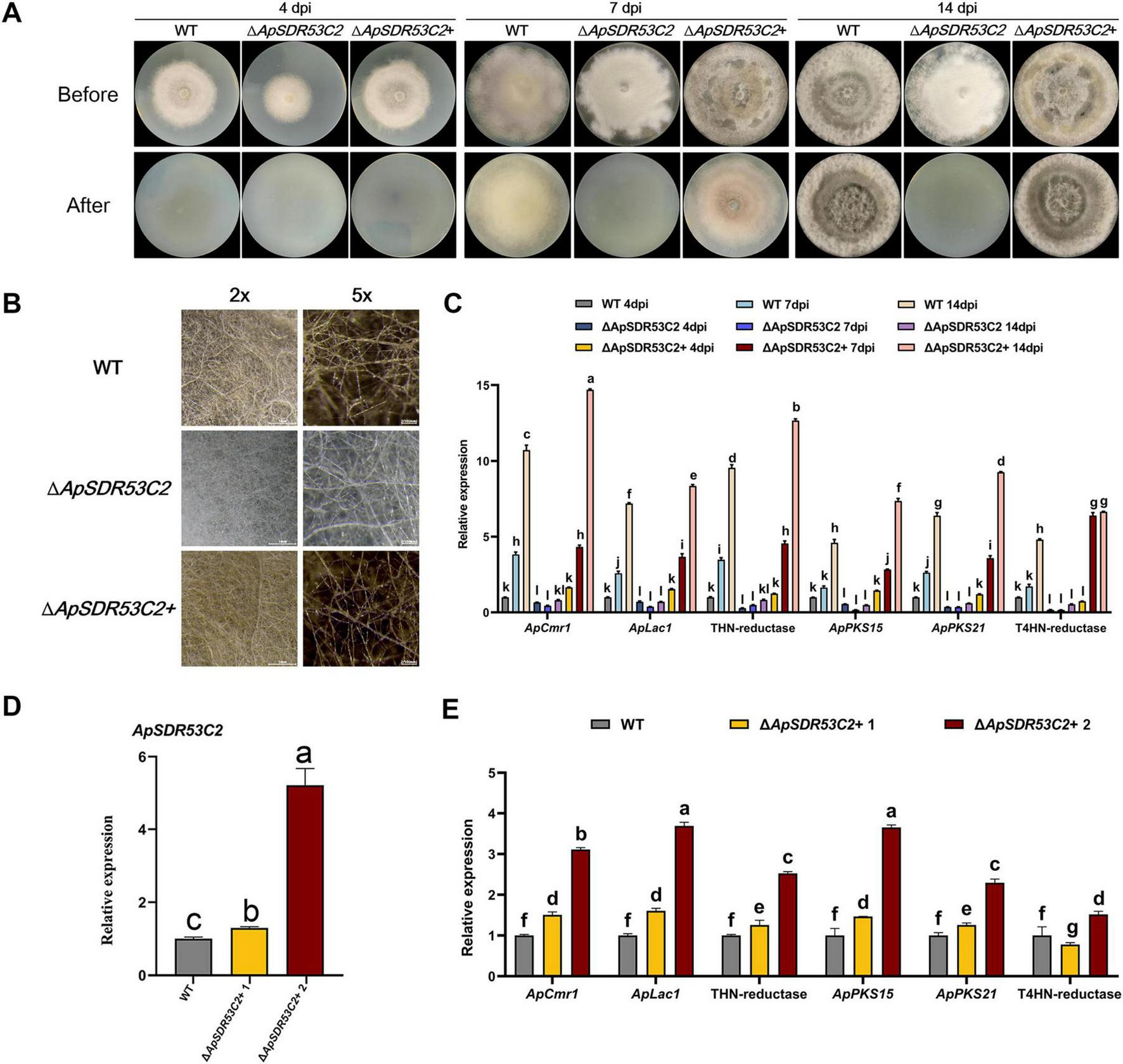 Analysis of ApSDR53C2 regarding melanin biosynthesis and cellulose membrane penetration functions. (A) Analysis of the cellulose membrane penetration ability of wild type, ΔApSDR53C2 and ΔApSDR53C2+. (B) Stereomicroscope observation of melanized hyphae. (C) The qPCR detection of melanin synthesis-related gene expression levels at different growth periods. (D) Various backfill transformants with differences in ApSDR53C2 expression. (E) Variations in melanin synthesis levels at different ApSDR53C2 expression levels. There are significant differences in the relative expression of different lowercase letters (p < 0.05).