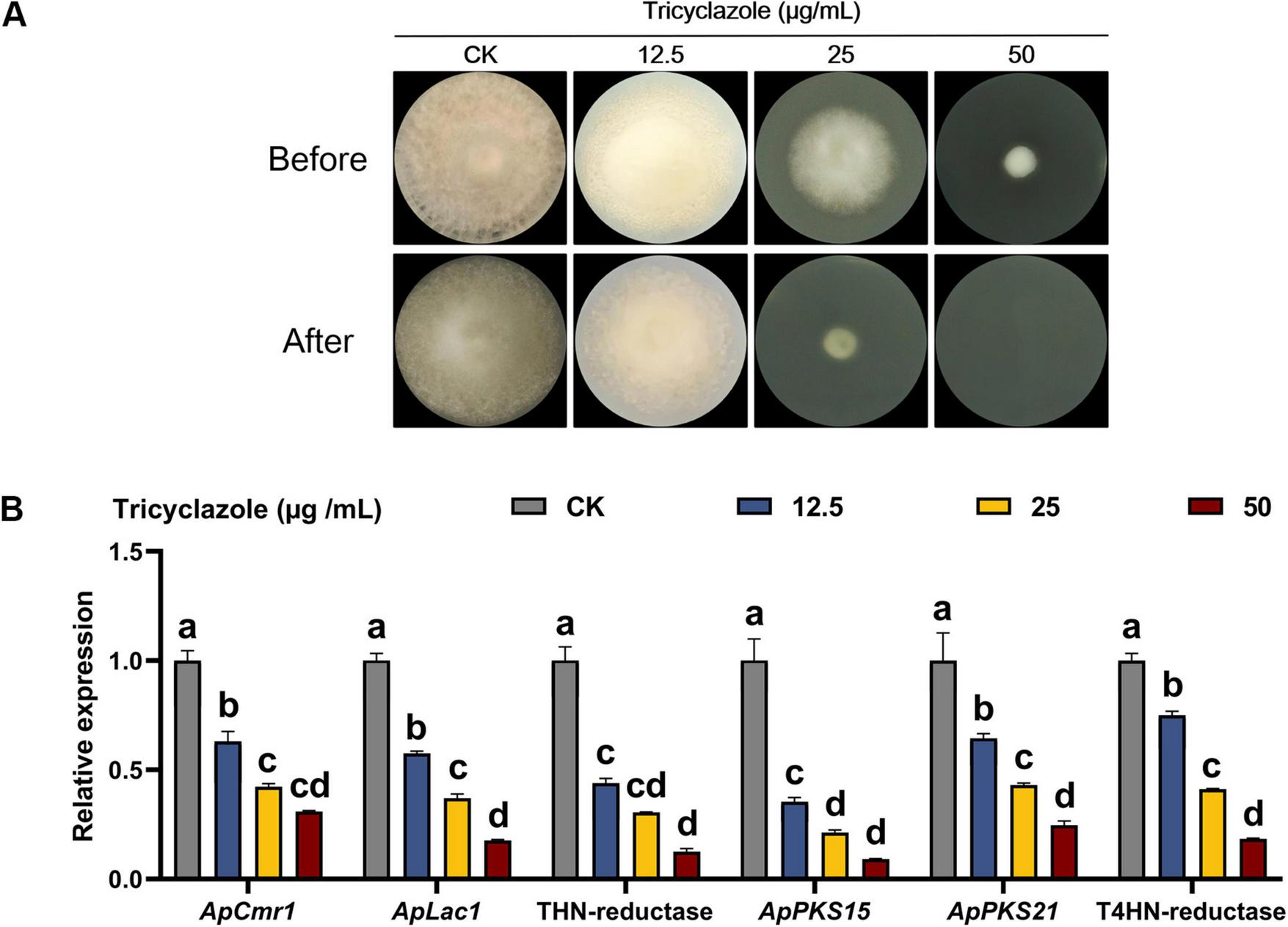 PDA mediums with tricyclazole concentrations of 0, 12.5, 25, and 50 μg/mL were prepared, respectively, and inoculated with WT and transformed strains after covering with sterile cellulose membrane. Then inverted at 25°C for 7 days. The expression levels of melanin-related genes were analyzed and recorded under the different conditions of treatment.