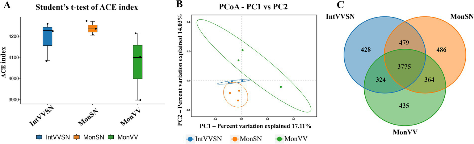 Alpha diversity analysis, as assessed by the ACE index, revealed no significant differences in microbial richness among MonSN, MonVV, and IntVVSN (Figure 2A; Supplementary Table S3). PCoA further revealed differences in the microbial community composition among the three treatments, with the first principal coordinate (PC1) explaining 17.11% of the variation and the second (PC2) explaining 14.03% (Figure 2B; Supplementary Table S4). IntVVSN and MonSN clustered more closely, whereas MonVV exhibited a distinct community structure. The Venn diagram revealed that 3,775 OTUs were shared across the three treatments, with 428, 486, and 435 unique OTUs in IntVVSN, MonSN, and MonVV, respectively (Figure 2C). These results underscored the shared and unique microbial communities shaped by different cropping systems.