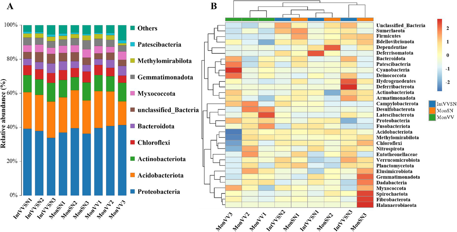 Relative abundance and clustering of bacterial phyla in IntVVSN, MonSN, and MonVV. (A) Relative abundance of dominant bacterial phyla; (B) Heatmap of bacterial phyla abundance patterns. MonSN, monoculture of S. nigrum; MonVV, monoculture of grapevine; IntVVSN, intercropping grapevine with S. nigrum. Serial numbers (1, 2, and 3) represent three repetitions.