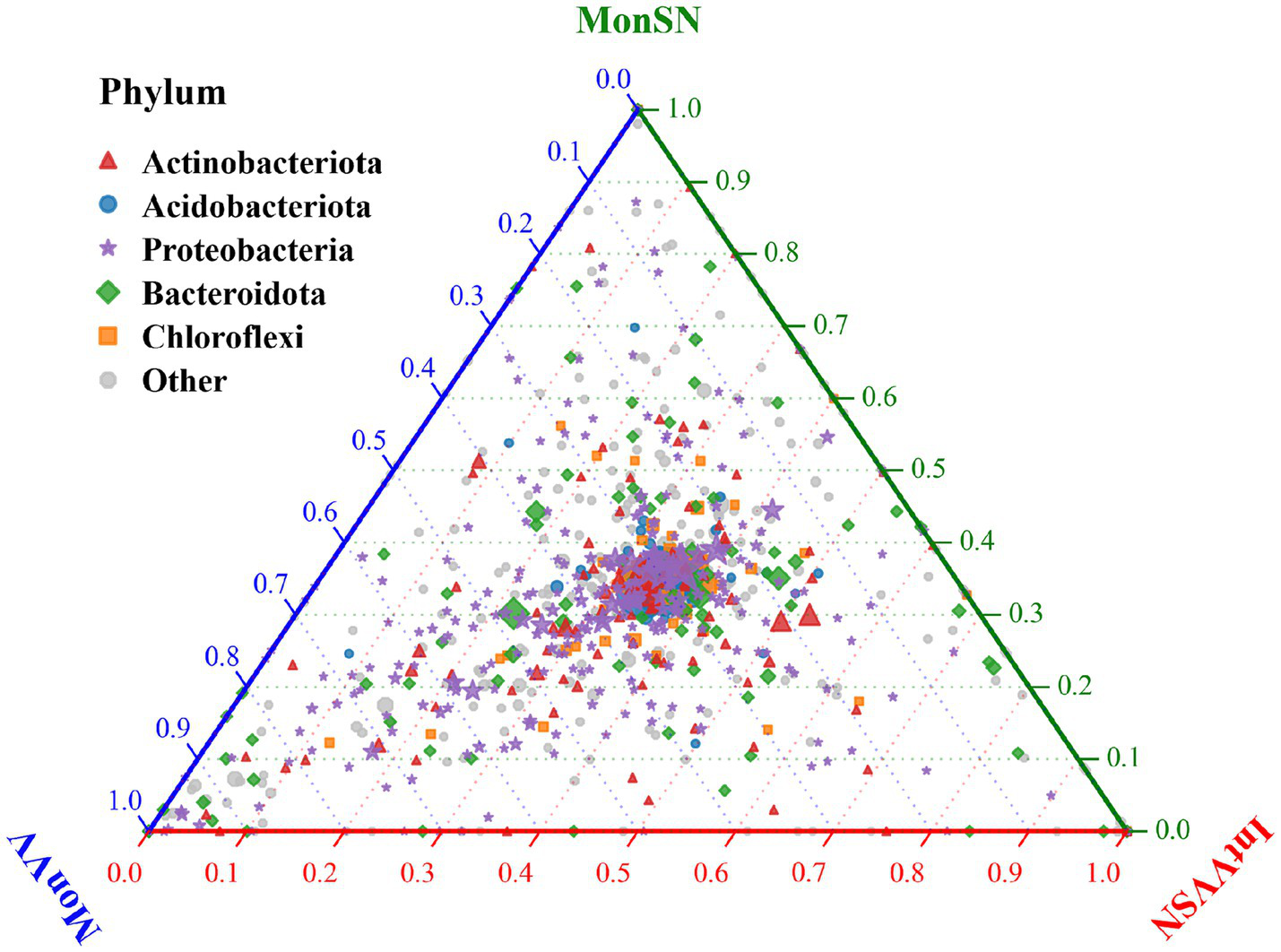 The ternary plot illustrated the relative abundance distribution of major microbial phyla across MonSN, MonVV, and IntVVSN (Figure 4). The results revealed that Proteobacteria and Bacteroidota were predominantly distributed in the central region of the plot, indicating that their relative abundances were fairly balanced across the three treatment groups, with no clear bias toward any specific group. Actinobacteria was positioned closer to the blue and green axes, suggesting relatively greater abundances of MonSN and MonVV. Acidobacteriota and Chloroflexi were evenly distributed across the plot, indicating that their abundances were consistent across all the treatment groups.