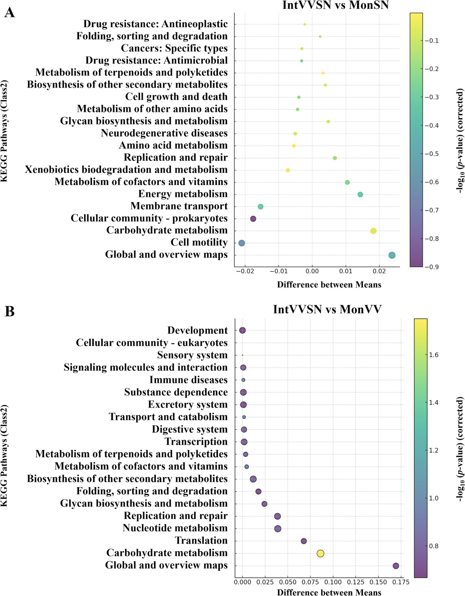 KEGG pathway enrichment bubble plots comparing the intercropping treatment with the single-planting treatments under Cd stress. The x-axis represents the difference in the mean relative abundance (%) of each pathway between the two groups, and the y-axis represents the KEGG pathways (Class 2). The size of each bubble corresponds to the absolute difference in mean relative abundance, and color intensity indicates statistical significance as measured by −log10 (p value corrected). (A) Comparison between IntVVSN and MonSN; (B) IntVVSN and MonVV. MonSN, monoculture of S. nigrum; MonVV, monoculture of grapevine; IntVVSN, intercropping grapevine with S. nigrum.