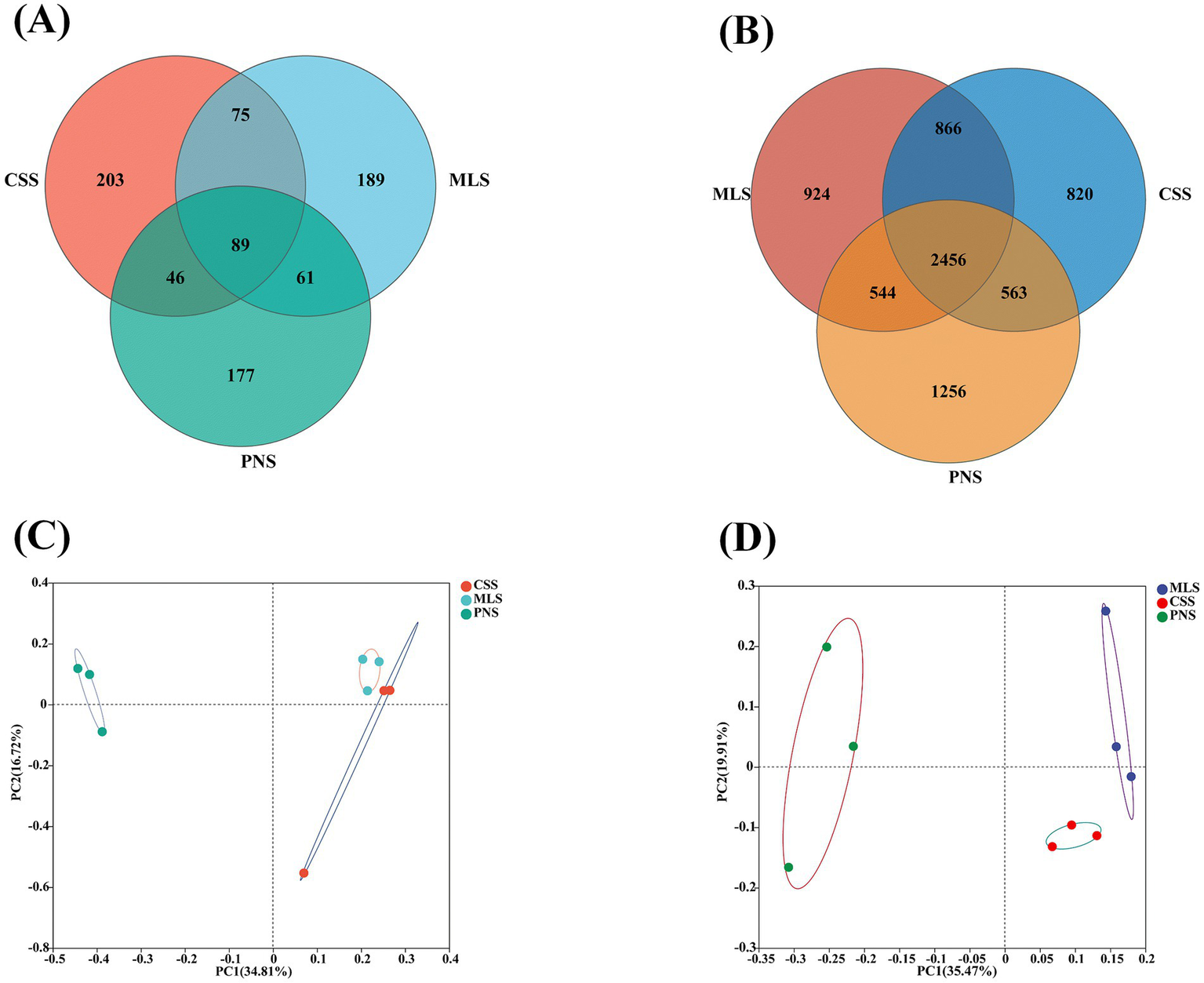 The OTU quantities of fungi and bacteria in the rhizosphere soil and roots of three wine grapes were analyzed. In the rhizospheric soil fungal community, OTU in PNS was 373, 9.90, and 9.68% less than MLS and CCS, respectively (Figure 2A). However, in the rhizospheric soil bacterial community, the number of OTU in PNS increased by 0.61 and 2.42% compared to MLS and CSS (Figure 2B), indicating that the microbial diversity in the rhizosphere soil of Pinot Noir is greater than that of Merlot and Cabernet Sauvignon. The first and second principal components of rhizospheric soil fungal PCoA analysis explained 34.81 and 16.72% of community variation, respectively (Figure 2C). However, the rhizospheric soil bacterial PCoA analysis explained 35.47 and 19.91% of community variation (Figure 2D). There is a significant separation in the rhizosphere soil samples of three wine grapes, showing notable variations in the microbial composition of the three wine grapes. At the same time, the distance between the Merlot and Cabernet Sauvignon samples is closer than that of the Pinot Noir sample, demonstrating that the microbial composition of the rhizosphere soil of wine grape Cabernet Sauvignon and Merlot is relatively similar to that of Pinot Noir.