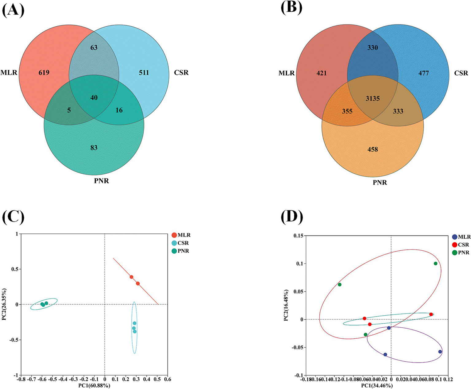 The endophytic fungal community in wine grape roots, with OTU numbers of 727, 630, and 144 in MLR, CSR, and PNR, respectively, shows significant differences in fungal diversity among the three wine grape roots, particularly in Pinot Noir, where fungal diversity is notably lower than in Cabernet Sauvignon and Merlot (Figure 3A). The difference lies in the endophytic bacterial community, with OUT numbers of 42,434,275 and 4,287 in MLR, CSR, and PNR, indicating that the diversity of endophytic bacteria in wine grape roots is similar (Figure 3B). In addition, the first and second principal components of PCoA analysis of endophytic fungi explained 60.88 and 26.35% of the community variation (Figure 3C). However, endophytic bacteria PcoA community variation explained 34.46 and 16.48% of the community variation (Figure 3D), demonstrating that endophytic fungi have more significant community composition variation than bacteria.