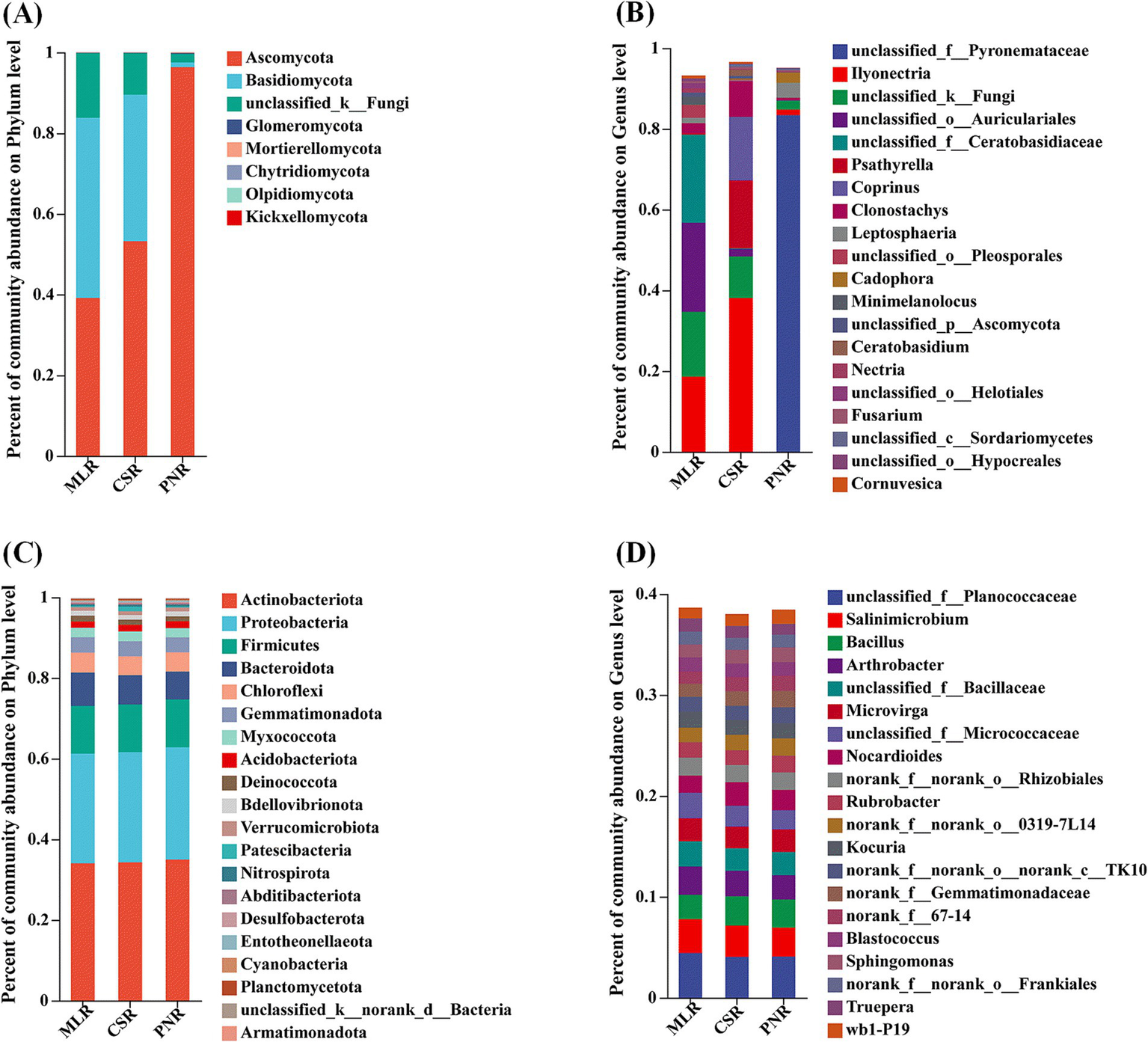 Microbial community composition in the rhizosphere soil of wine grapes. (A) Fungal community at the Phylum level. (B) Fungal community at the Genus level. (C) Bacterial community at the Phylum level. (D) Bacterial community at the Genus level.