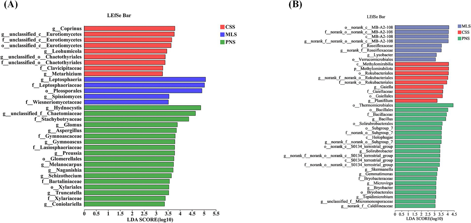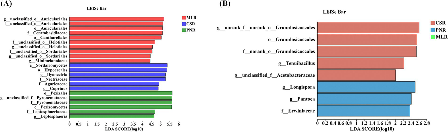 LEfSe analysis of endophytic microorganisms in wine grape roots. (A) Endophytic fungal LEfSe. (B) Endophytic Bacteria LEfSe.