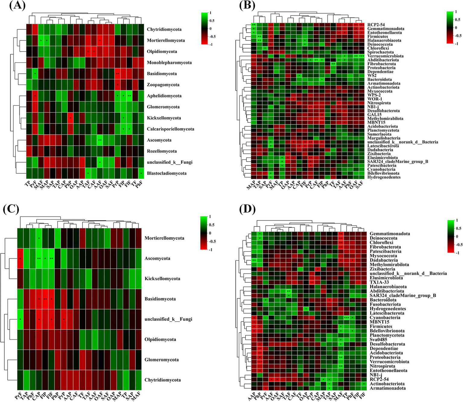 The correlation between organic acids and phenolic substances in the fruit flesh and peel of wine grapes and rhizosphere microorganisms at the Phylum level. (A) The heatmap of the correlation between fungal communities and organic acids and phenolic substances in the rhizosphere soil of wine grapes. (B) The heatmap of the correlation between bacterial communities and organic acids and phenolic substances in the rhizosphere soil of wine grapes. (C) The heatmap of the correlation between endophytic fungal communities in wine grape roots and organic acids and phenolic substances. (D) The heatmap of the correlation between endophytic bacterial communities in wine grape roots and organic acids and phenolic substances.