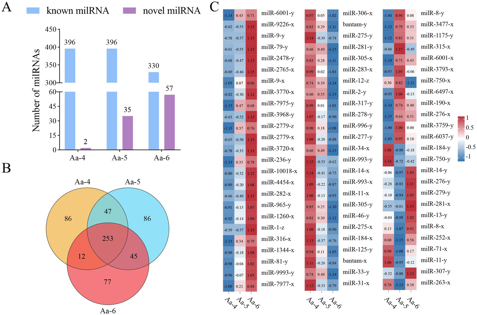 In the Aa-4 group, 398 milRNAs were identified, including 396 known and 2 novel ones. A total of 431 milRNAs were detected in the Aa-5 group, including 396 known and 35 novel ones. Additionally, 387 milRNA, including 330 known and 57 novel milRNAs, were found in the Aa-6 group (Figure 1A). Venn analysis indicated that 253 milRNAs were shared by the Aa-4, Aa-5, and Aa-6 groups, whereas there were 86, 86, and 77 specific milRNAs, respectively (Figure 1B). As shown in Figure 1C, these shared milRNAs displayed various expression trends during the process of A. apis infection, with 68 (54) milRNAs showing a continuous up-regulation (down-regulation) trend (Supplementary Figure S1).